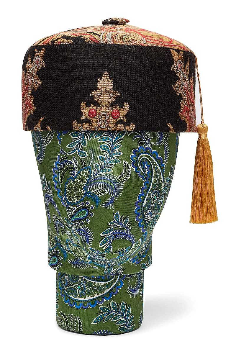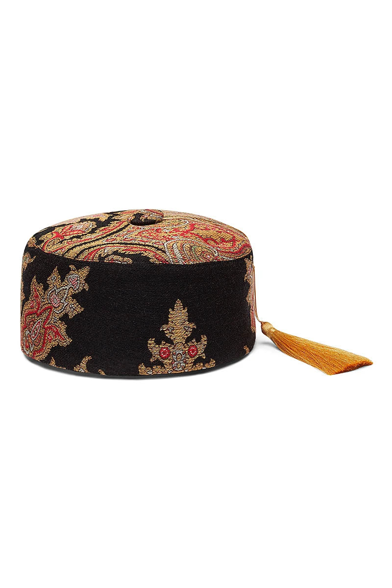 A smoking hat, handmade from cloth with a black base contrasted with a striking paisley design with strokes of gold, red and sage. Made with a quilted lining and silk tassel.