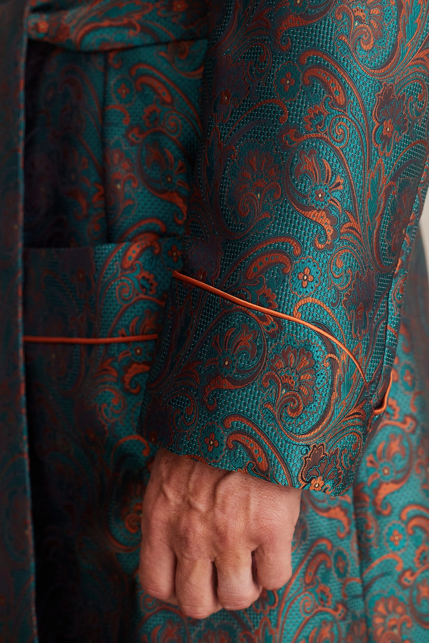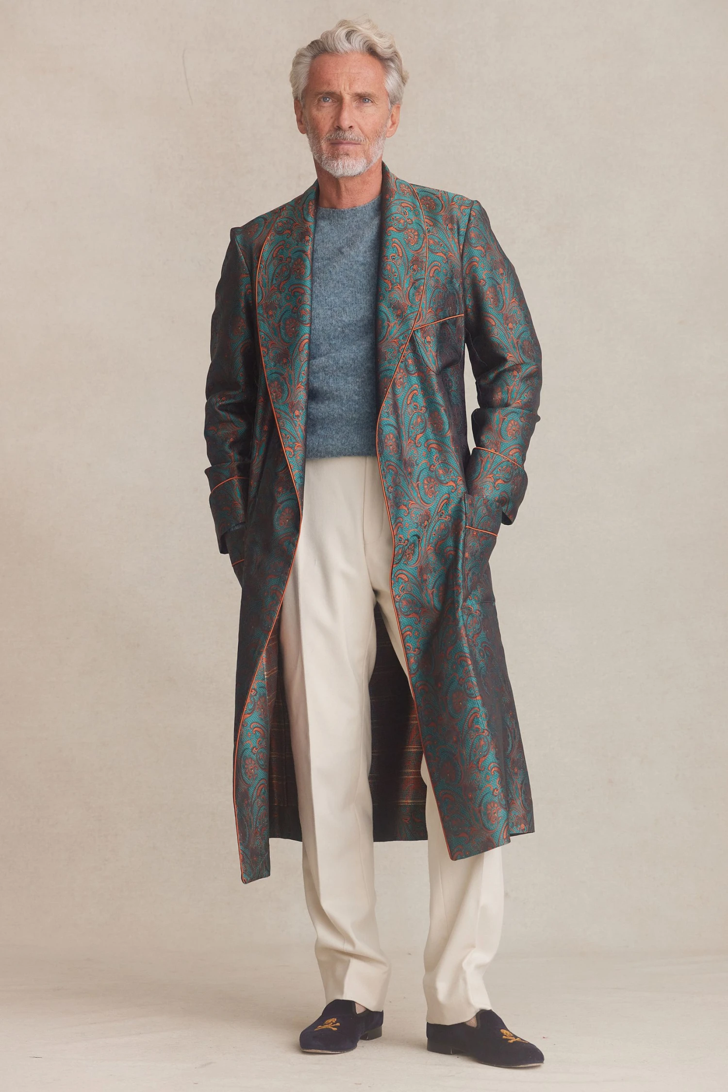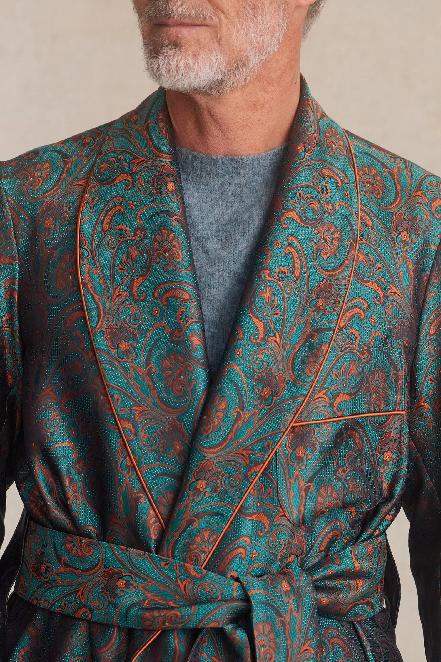 Made in England from Italian silk, this unlined dressing gown features a deep teal and bronze paisley with a rich gum-finished handle.