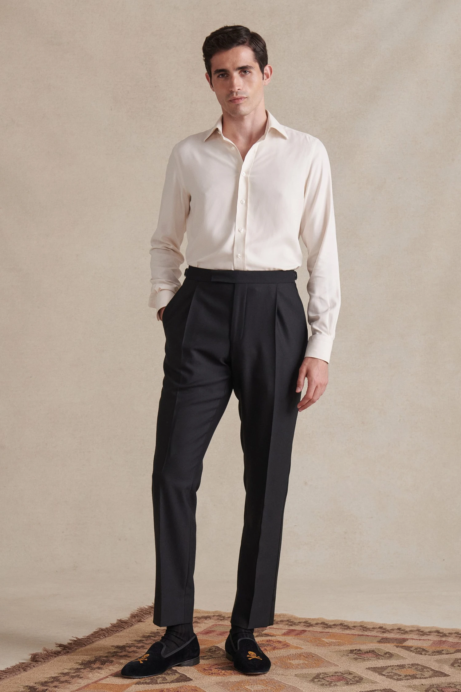 These black dinner suit trousers are cut from a pure wool with a high rise and a single pleat, resulting in a sleek and timeless look. Barathea silk trimming down the sides pair with the lapels of the matching jacket. It features side adjusters and a zip fly.
