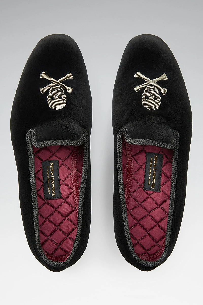 A perennial favorite. Our skull & crossbones motif, richly embroidered in gold silk on plush jewel-toned cotton velvet with black quilted lining and grosgrain binding. Understated with a dash of drama.