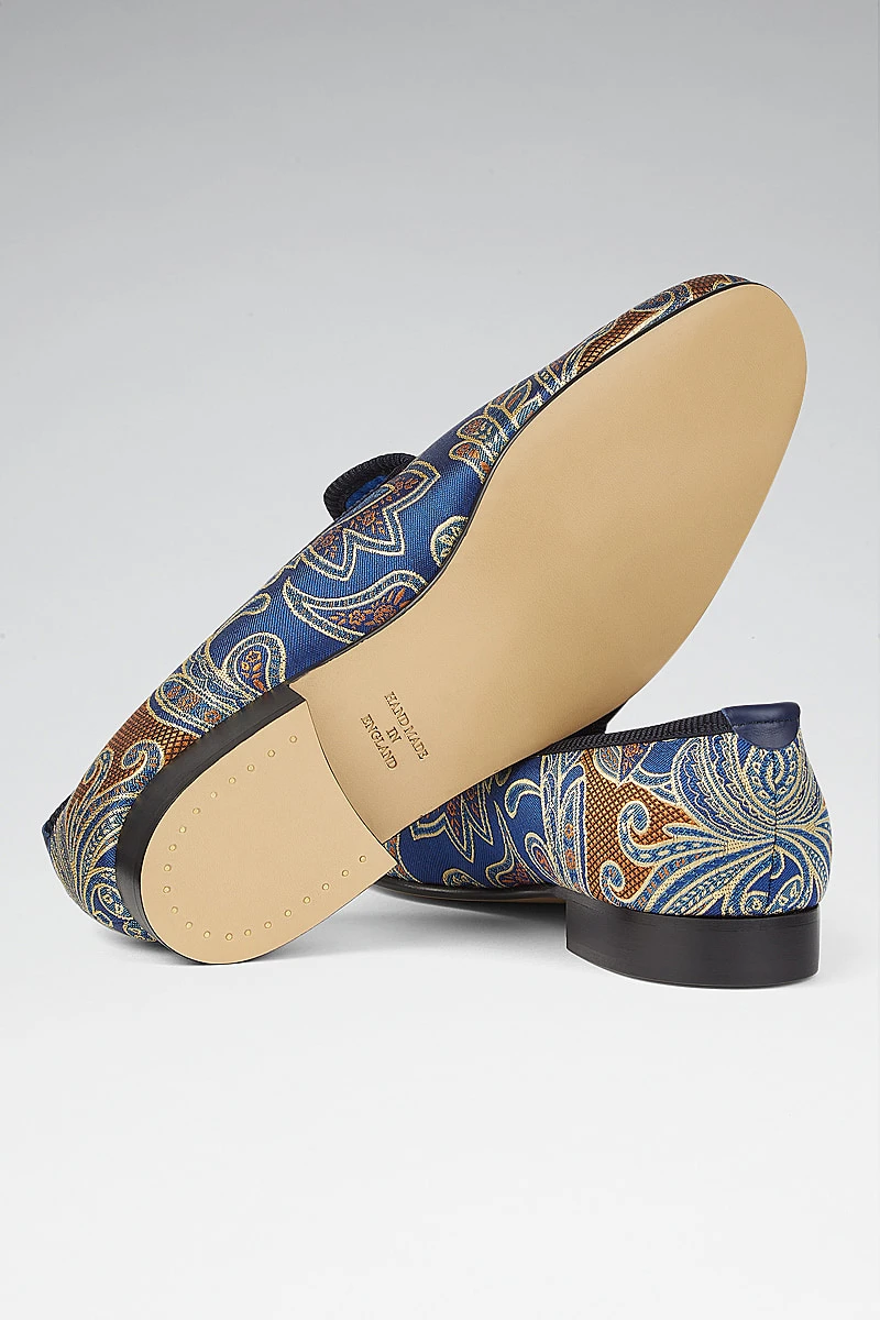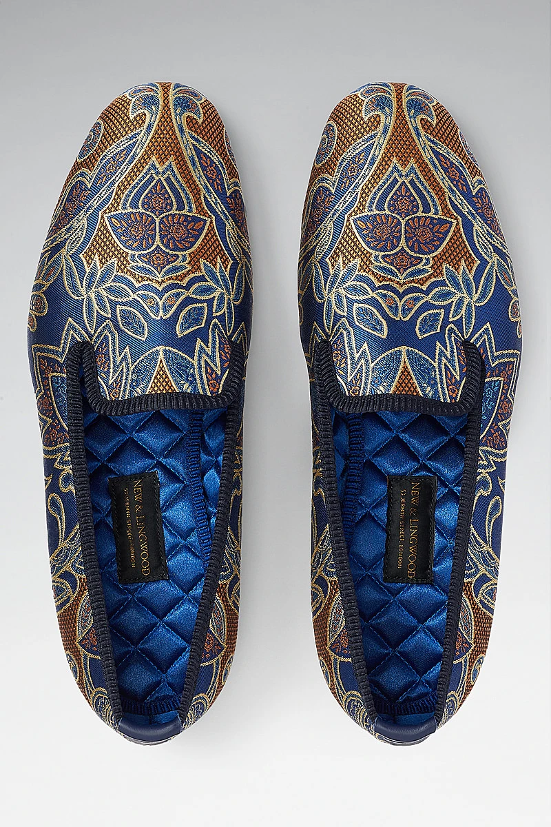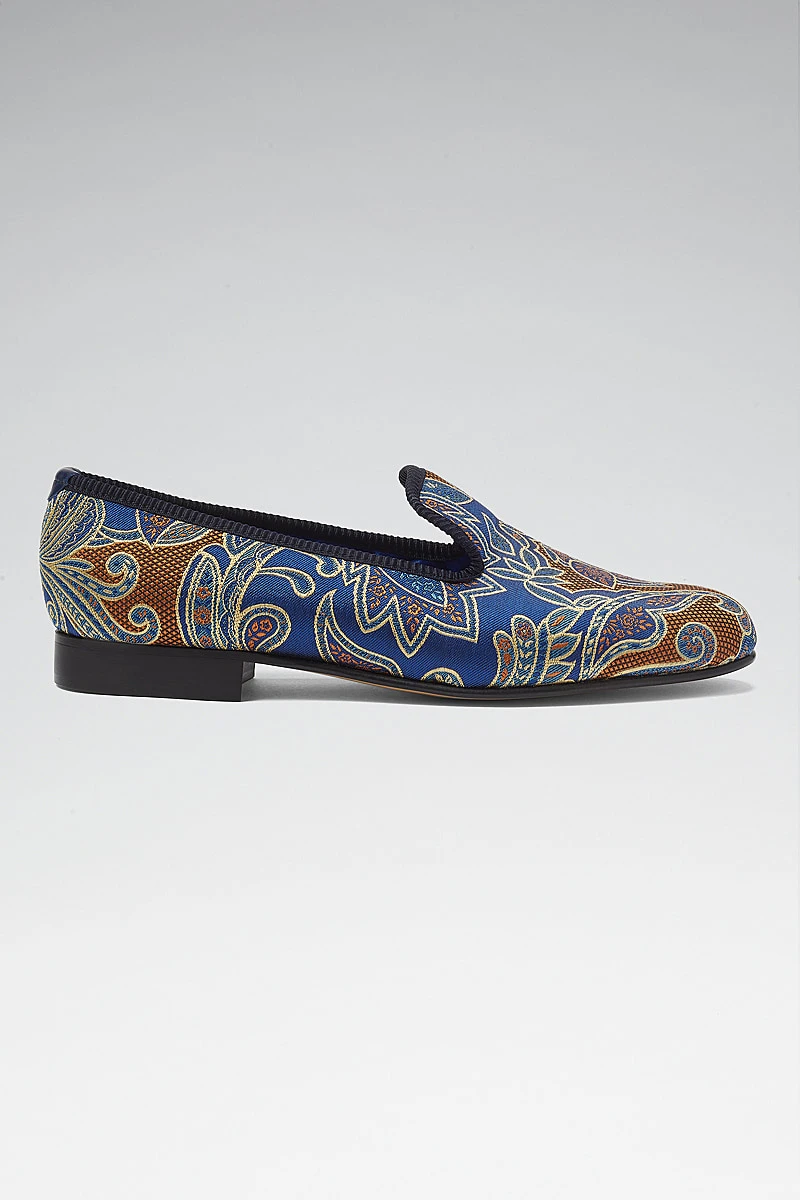 Our Blue & Orange Sohal Paisley Outdoor Slippers are handmade in England on our traditional Albert slipper block. The uppers are made from 100% woven silk featuring our recgonisable Sohal Paisley pattern and finished with a quilted lining, contrast grosgrain binding, and a rubber outdoor sole.