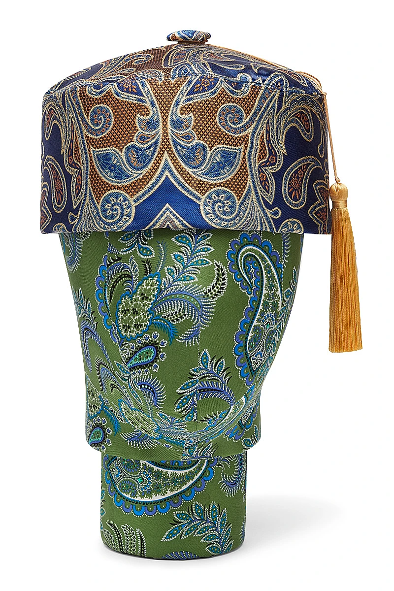 A silk smoking hat, handmade from cloth with an intricate paisley pattern. Made with a quilted lining and silk tassel.