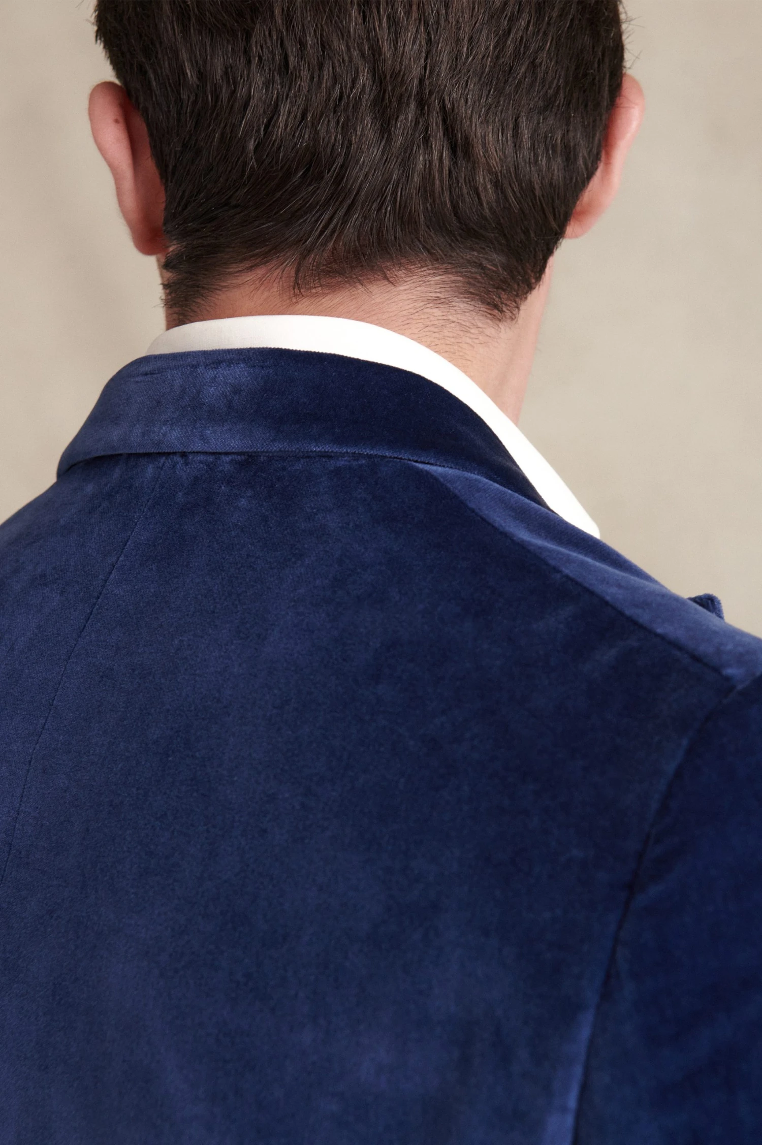 A single breasted velvet jacket in baltic blue. Made with a peak lapel, single button and working cuff. Cut from a medium-weight velvet, fully-lined with a single vent.