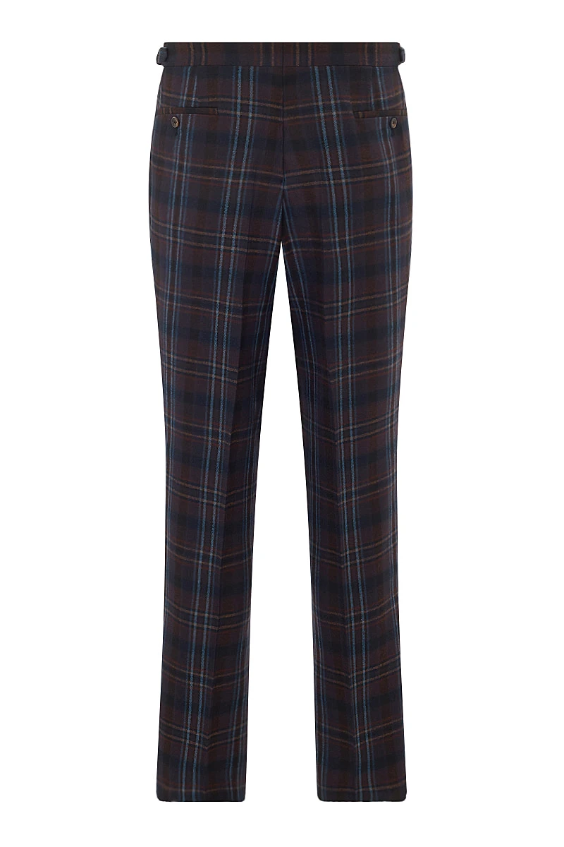 Available in a variety of colour options our wool tartan trousers add an elegant flourish to traditional evening dress. Featuring single reverse pleats and side adjustment tabs for a sleek silhouette.
