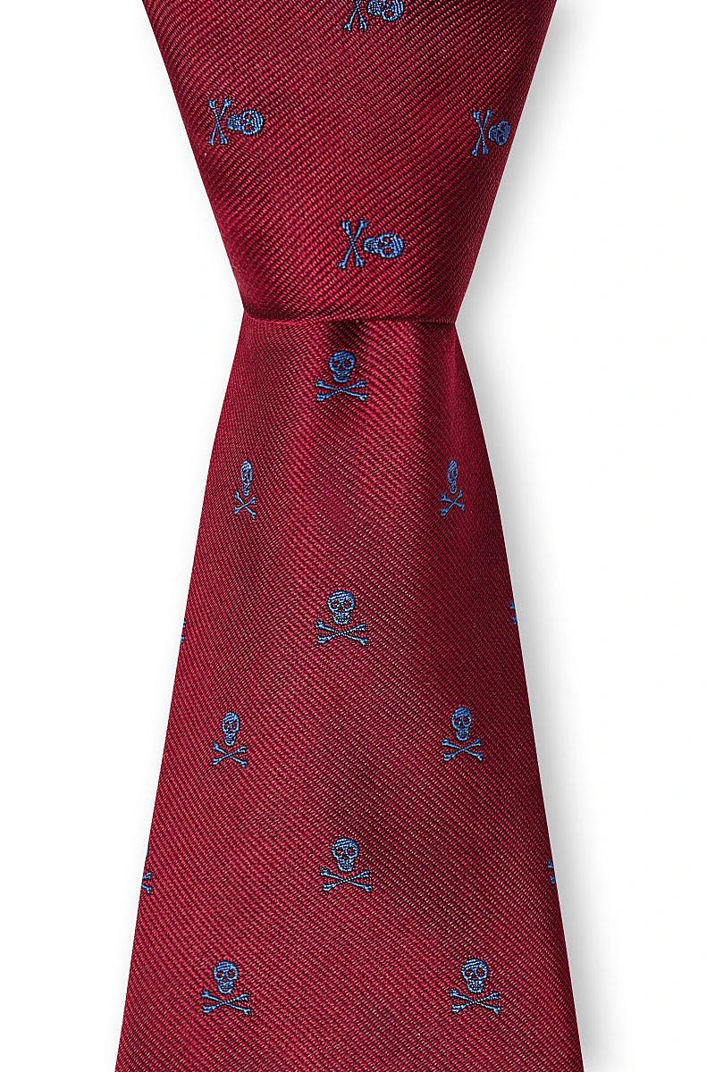 The subtle skull & bones woven into this necktie made an irreverent yet elegant statement. Woven in Sudbury, Suffolk — the traditional heart of English silk production. Hand-finished and self-tipped with slip-stitch construction.