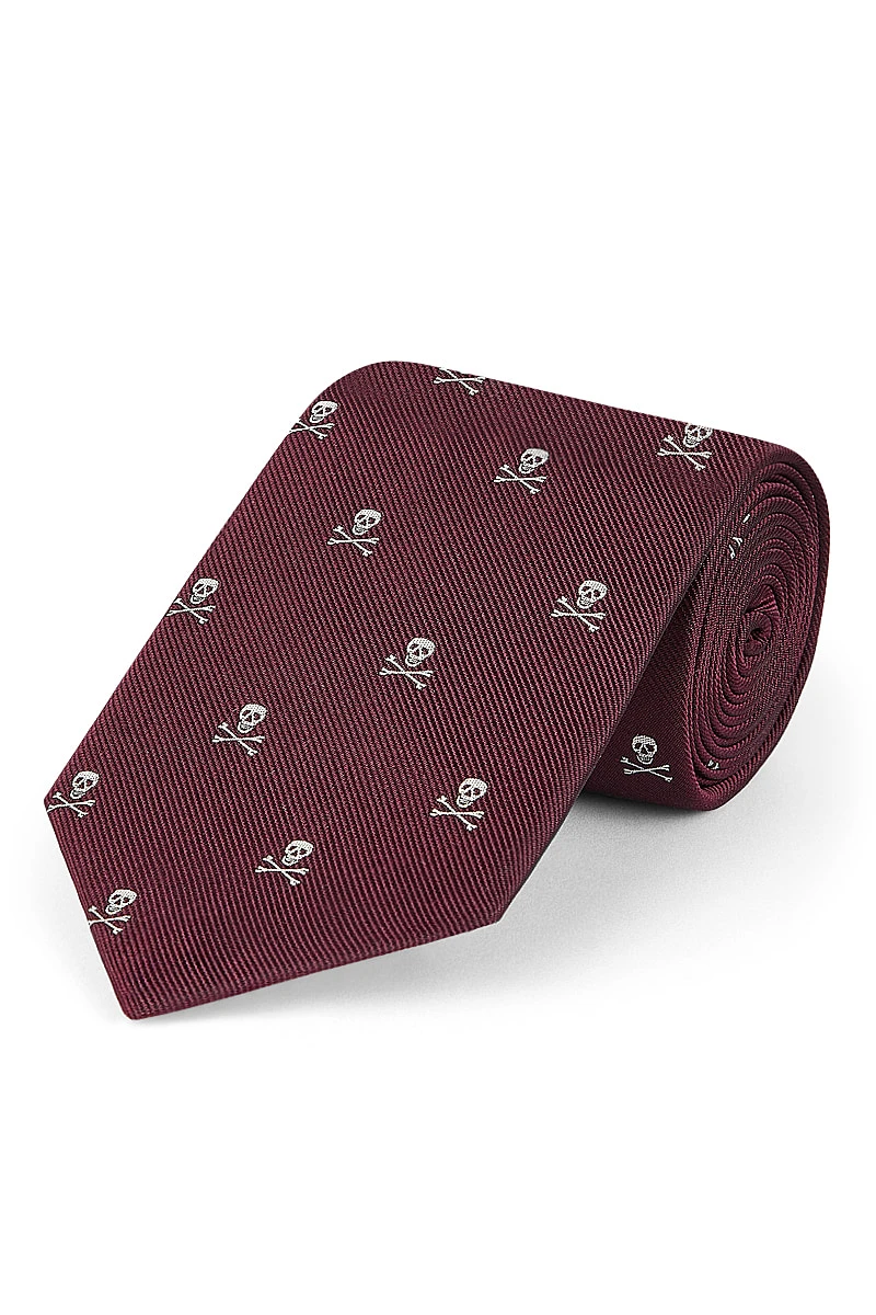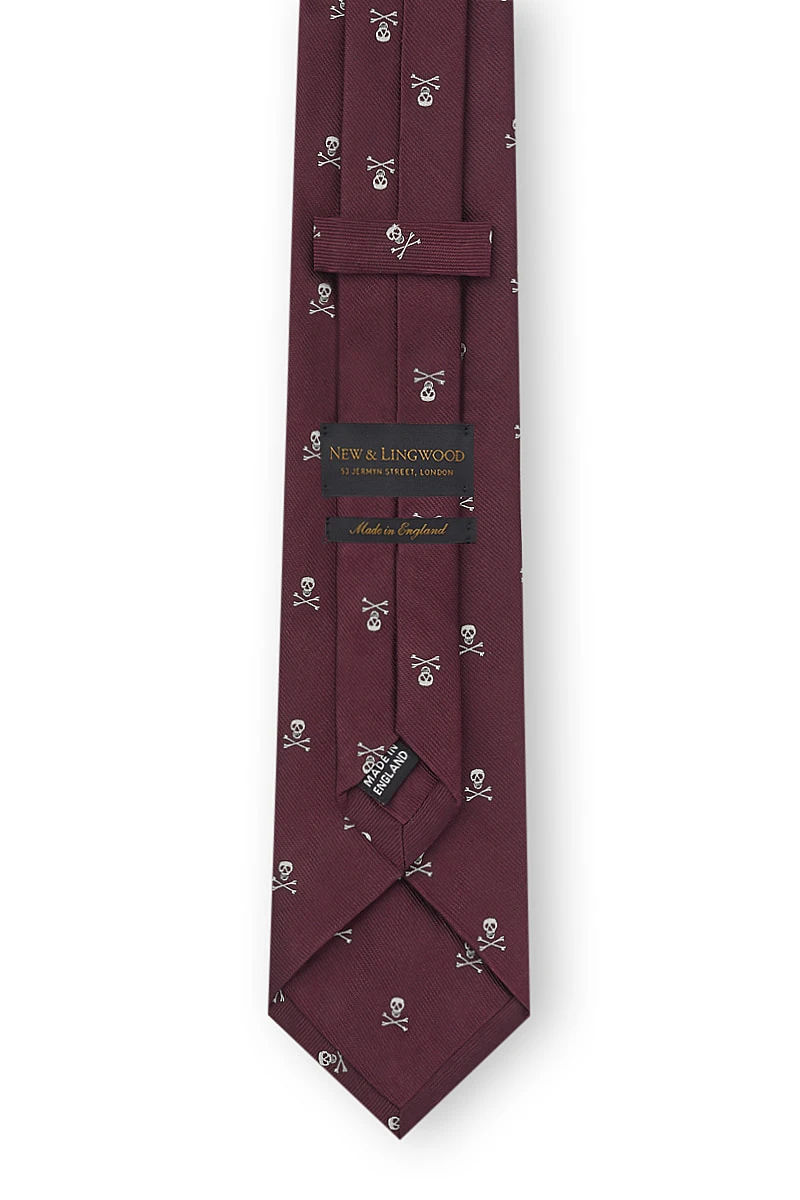 This classic sik tie features the skull & crossbones motif woven into the silk for a subtle statement. Woven in Sudbury, Suffolk – the traditional heart of English silk production. Hand-finished and self-tipped with slip-stitch construction.