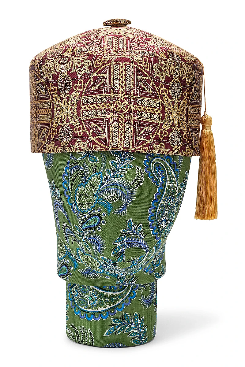 A silk smoking hat, handmade from cloth with a burgundy and gold rococo pattern. Made with a quilted lining and silk tassel.