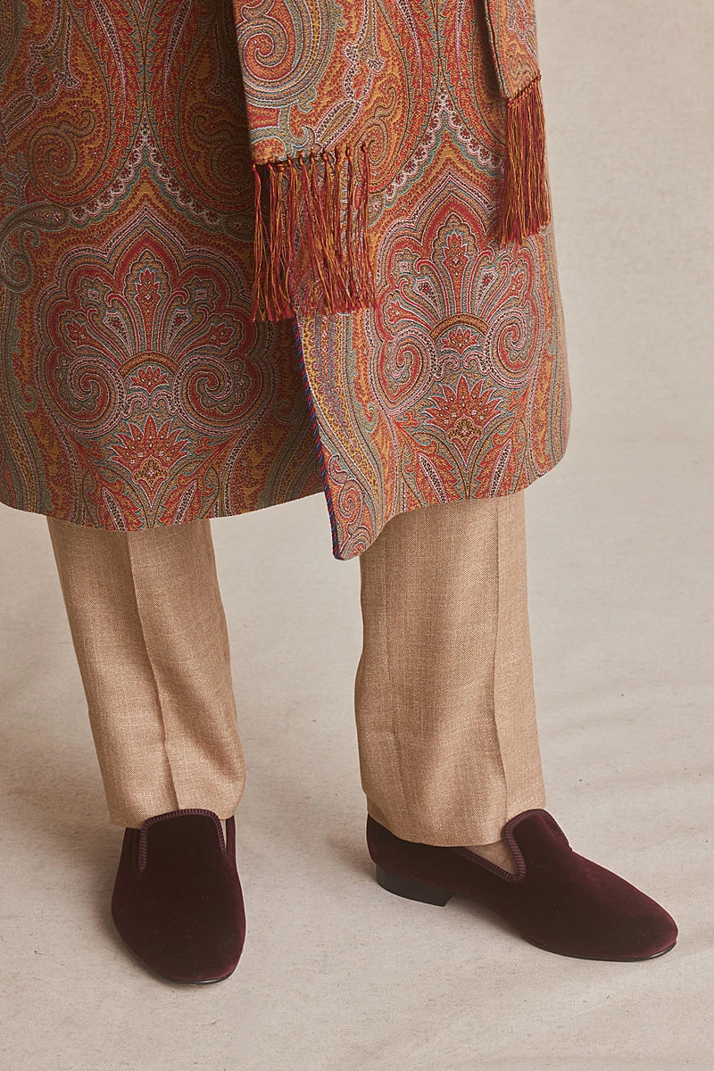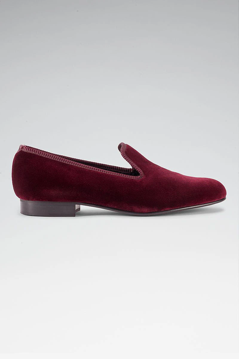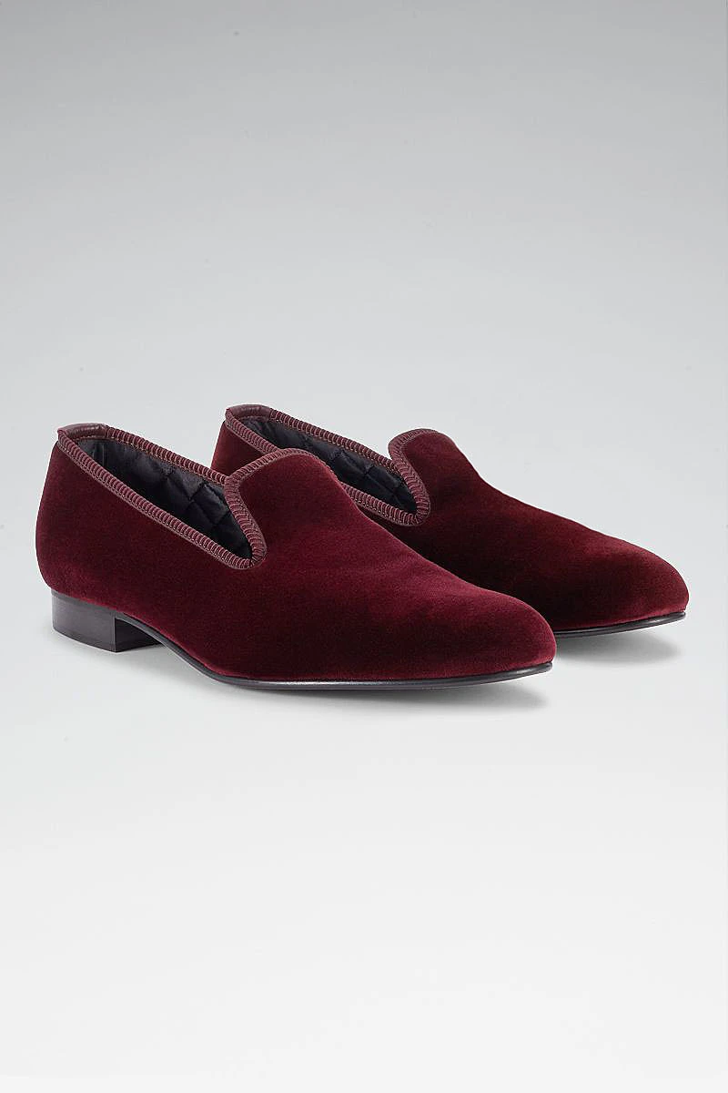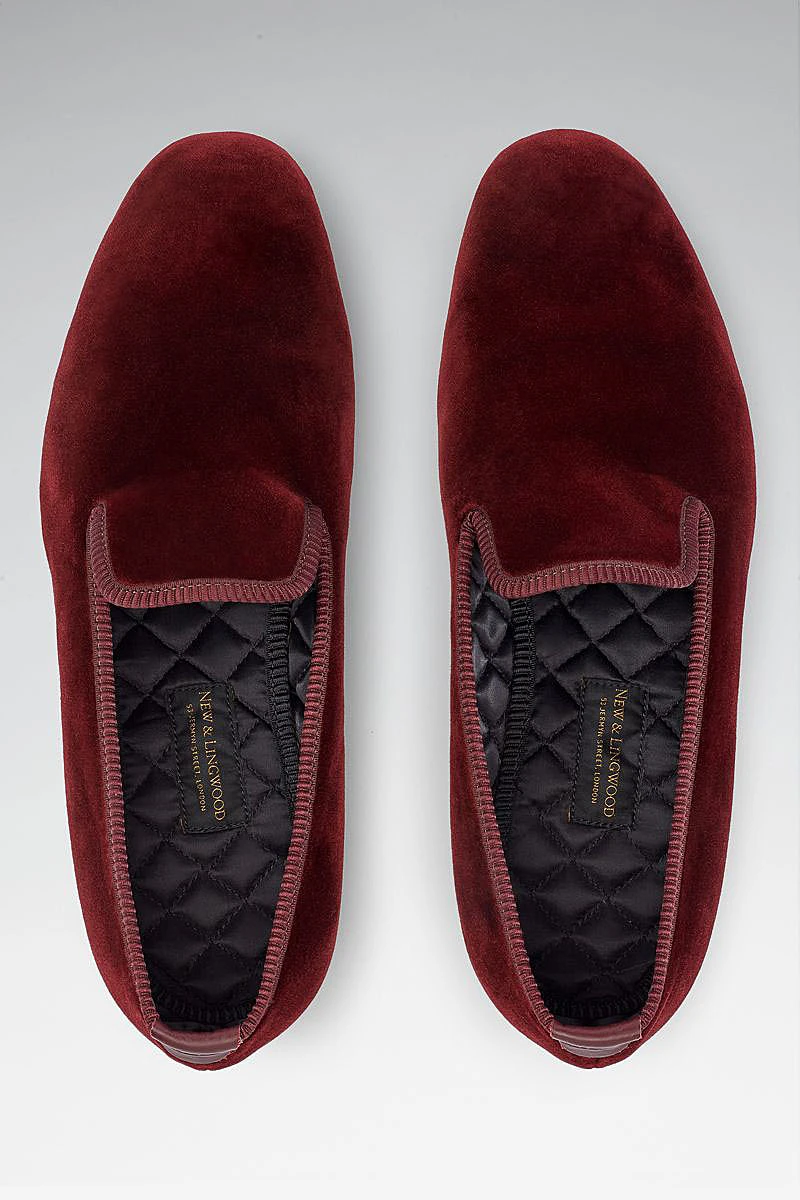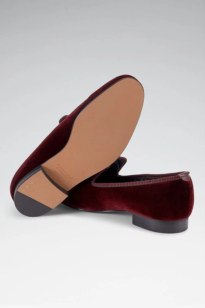 We have updated our classic velvet Albert slippers to feature a soft slimline rubber sole to make a shoe that is fit for all purposes whilst maintaining their traditional elegance. Boasting a luxuriously rich burgundy velvet outer layer these slippers are fully lined with quilted black silk for additional comfort.