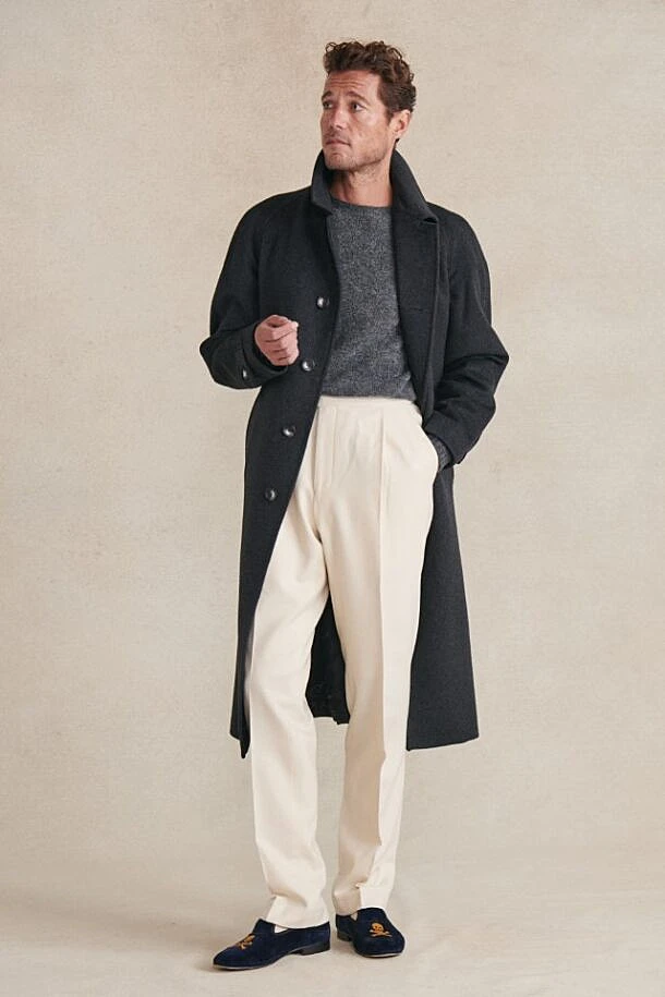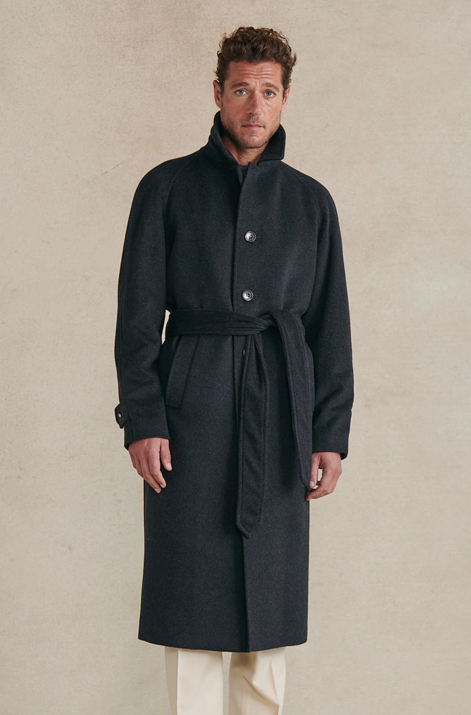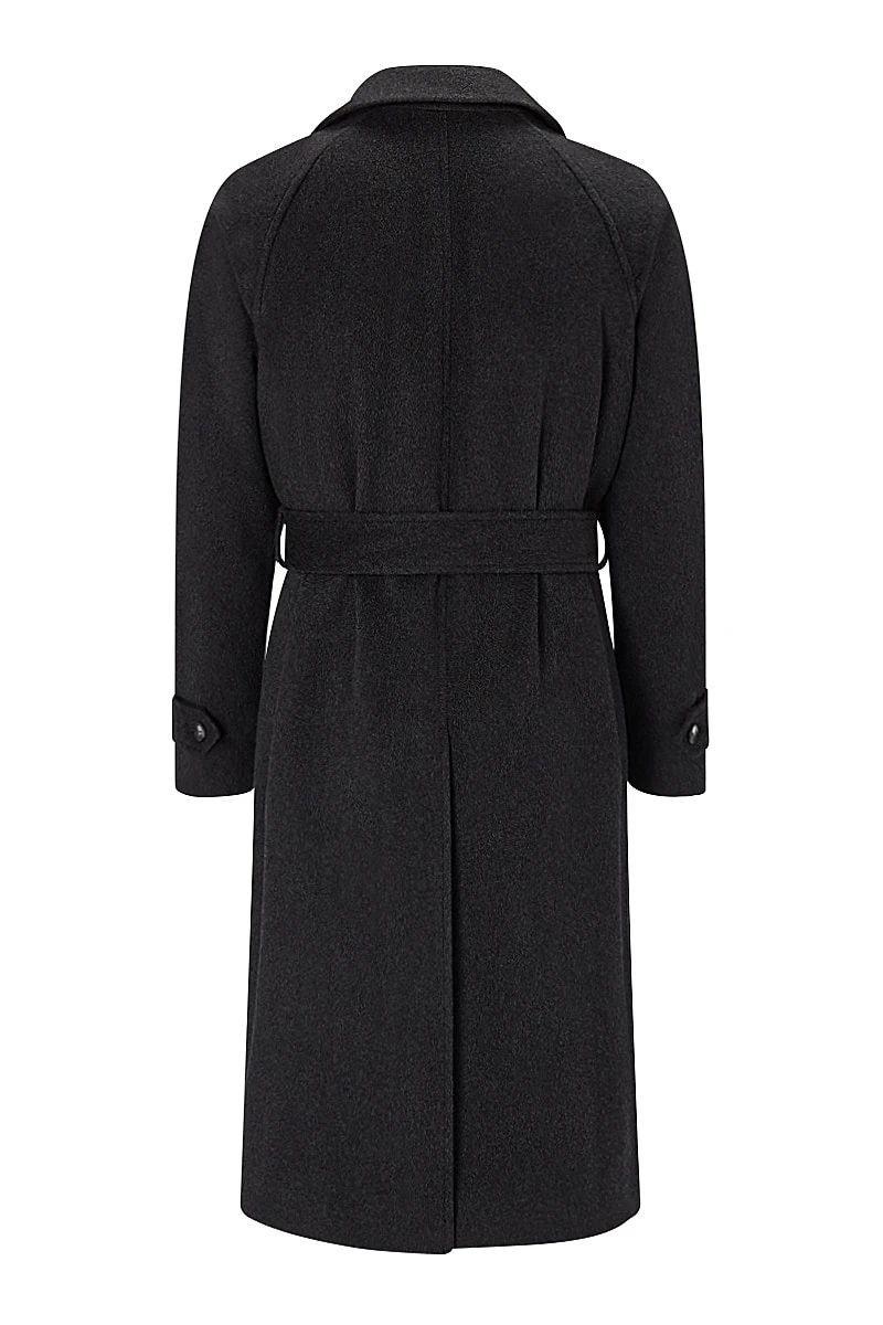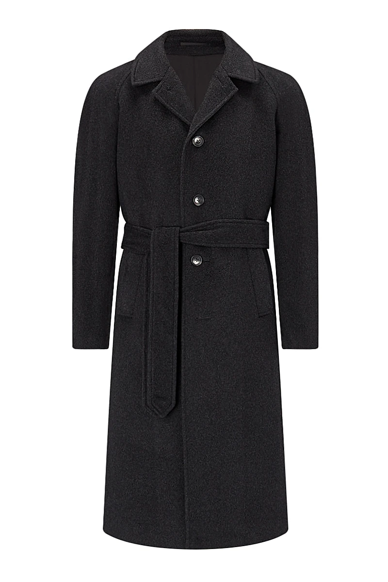 A classic overcoat silhouette elevated through the use of pure cashmere in charcoal grey, the Grey Cashmere Wrap Coat is a wardrobe essential for urban living. It’s cut with a raglan sleeve, which allows one to easily wear suiting or heavy knitwear beneath, whilst the wrap-around belt enhances the look. With a five-button front, it has adjustable cuffs and two slanted pockets.