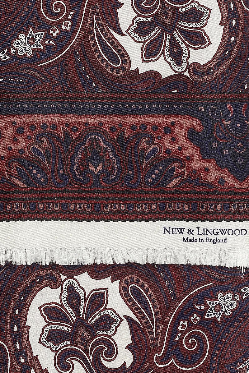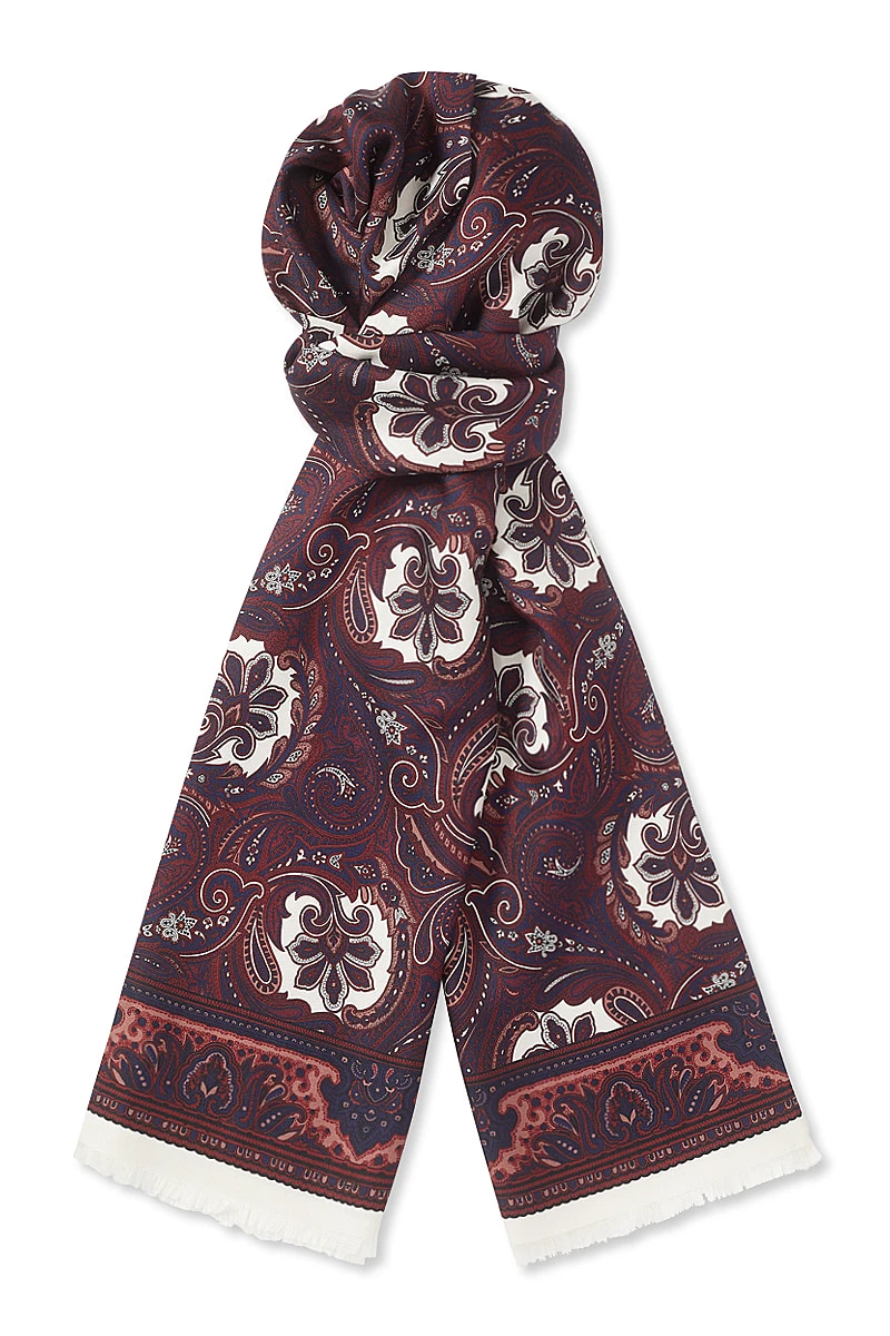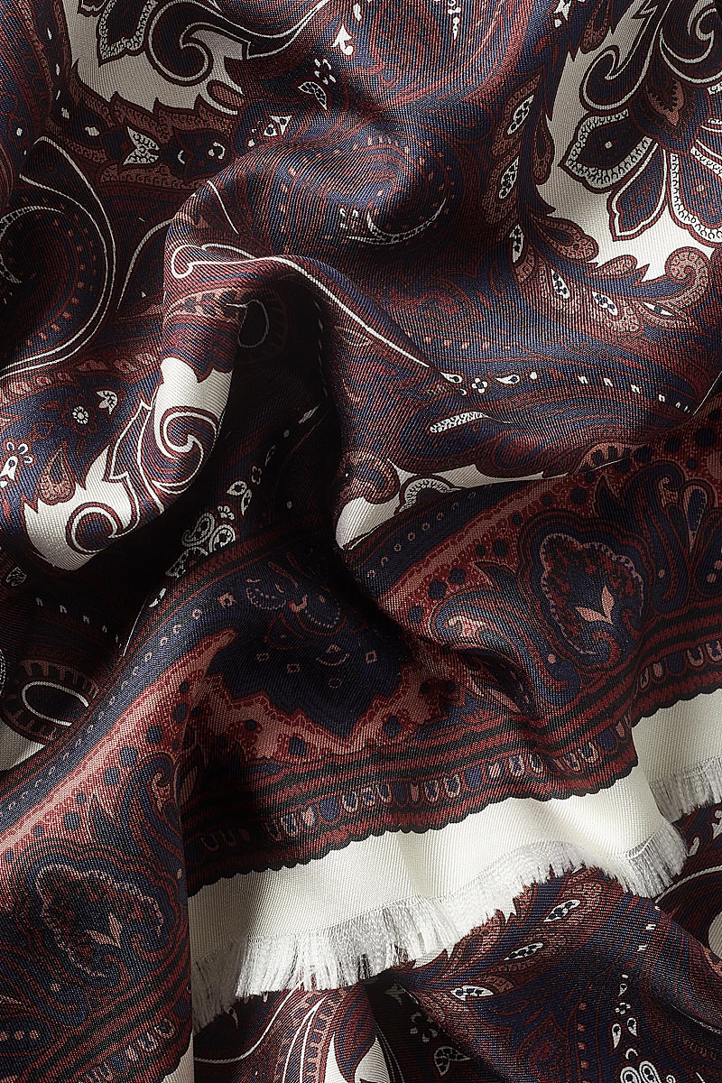 An intricately bold border encloses a field of larger-scale paisley on this 100% silk pin-fringed scarf.