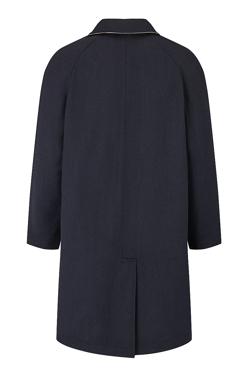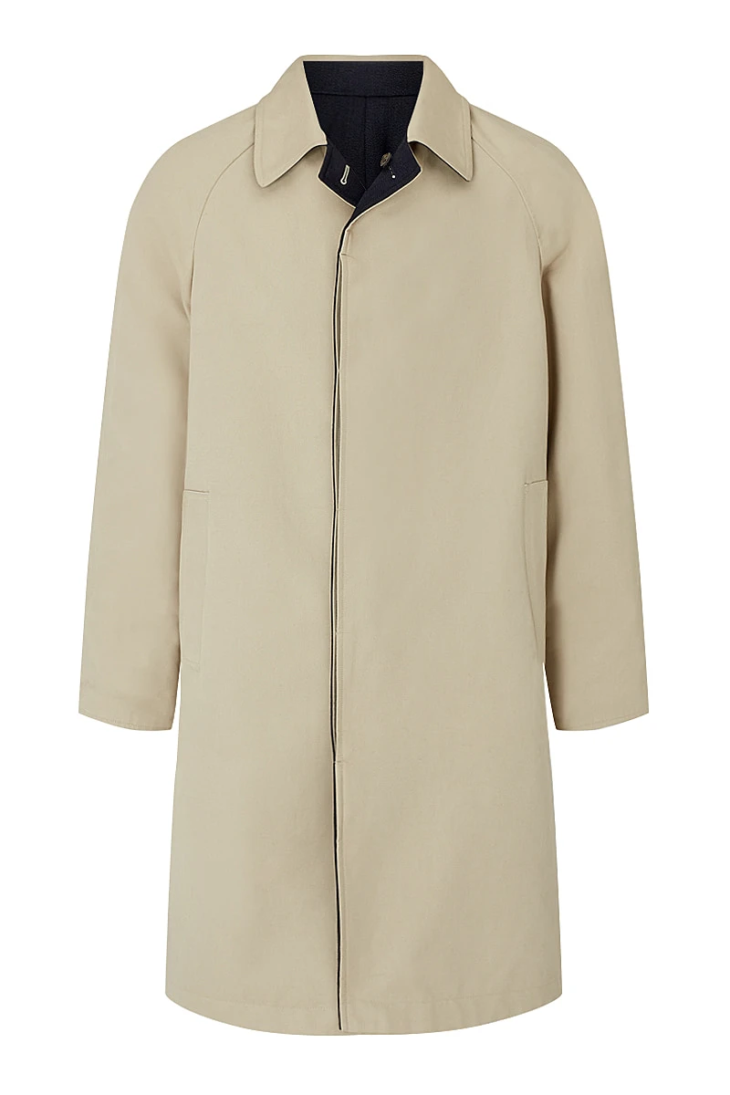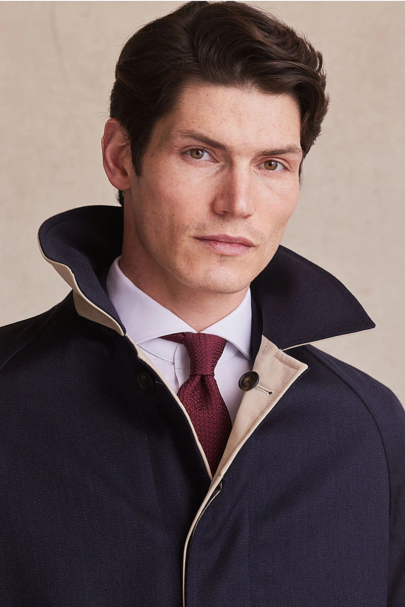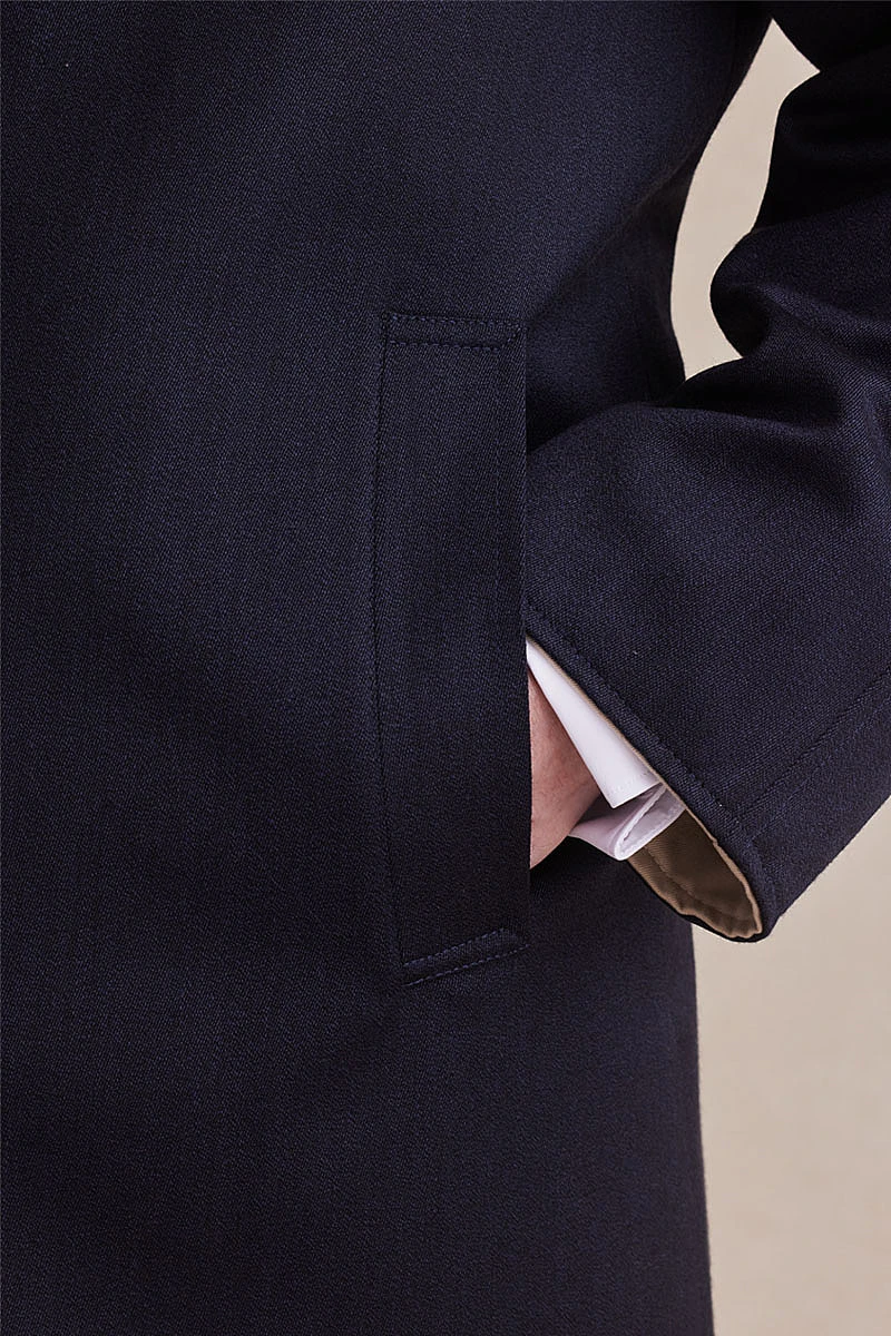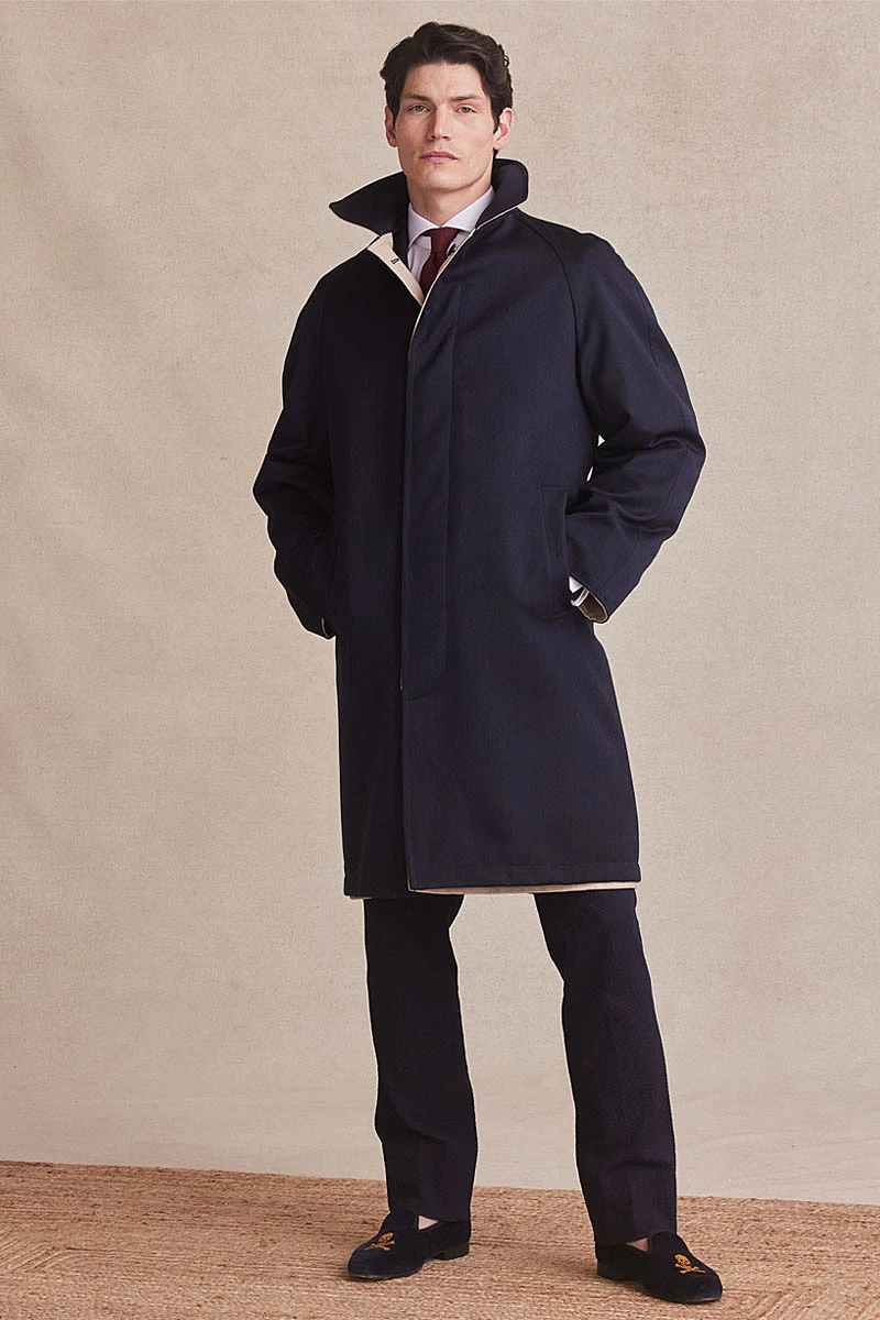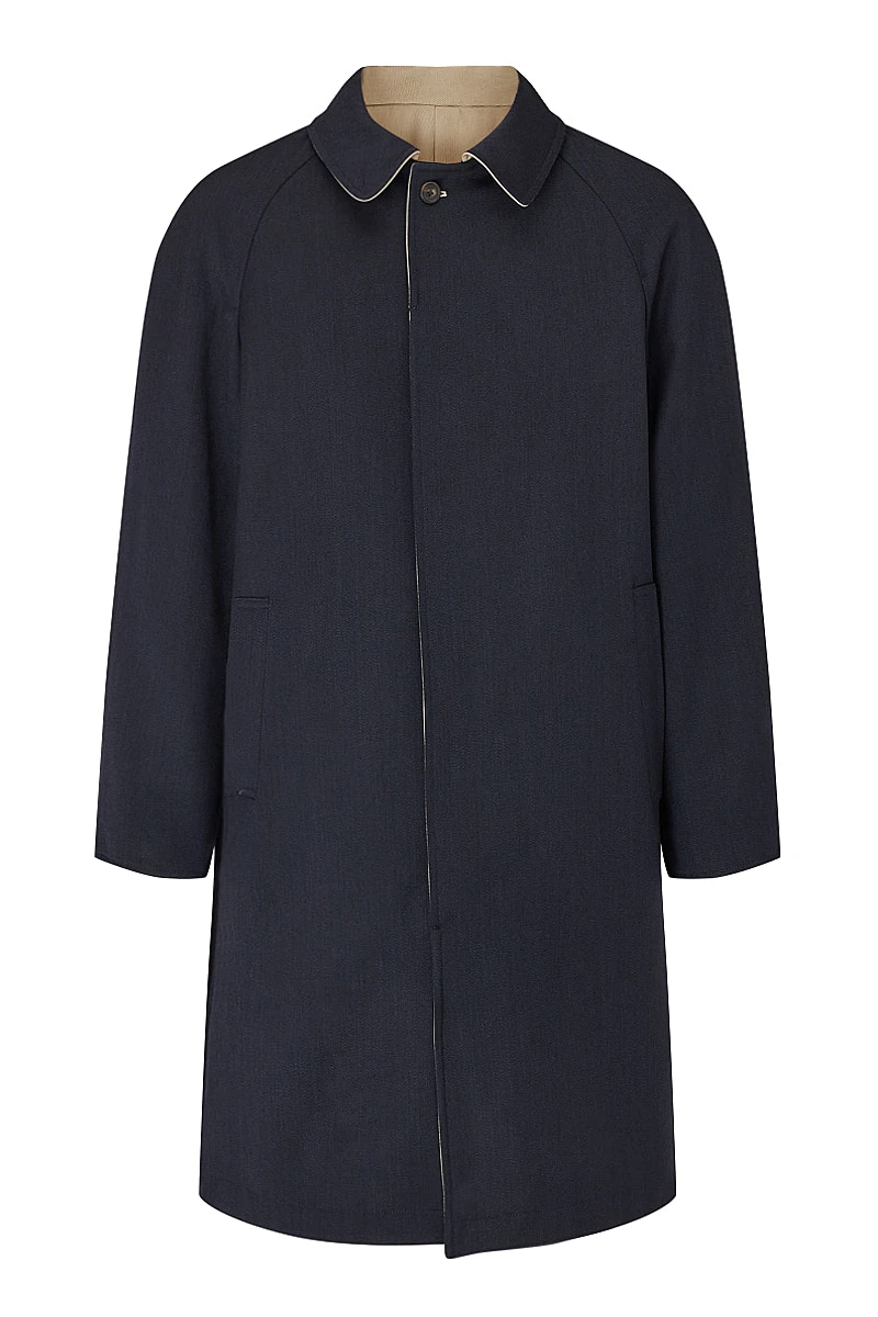 Our signature reversible runcorn overcoat returns with 100% worsted wool in navy on one side and 100% cotton water resistant garbadine in cream on the other. Finished with hidden inseam side pockets and a 5 faux horn button closure covered by a seamless placket.
