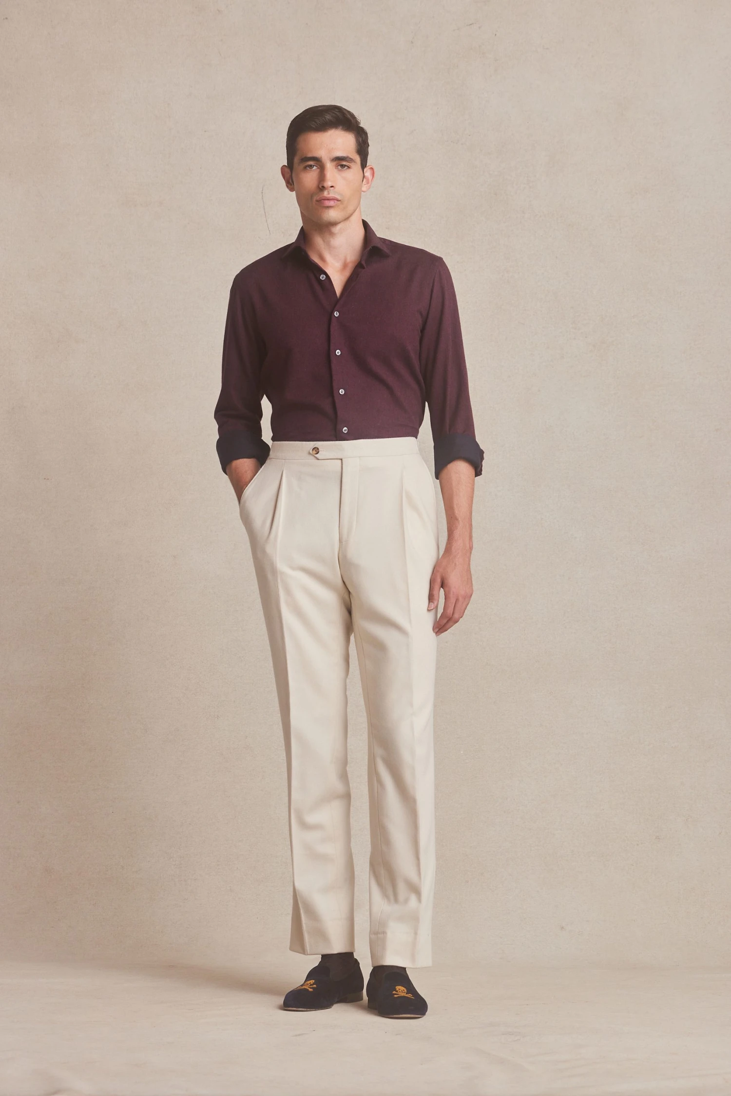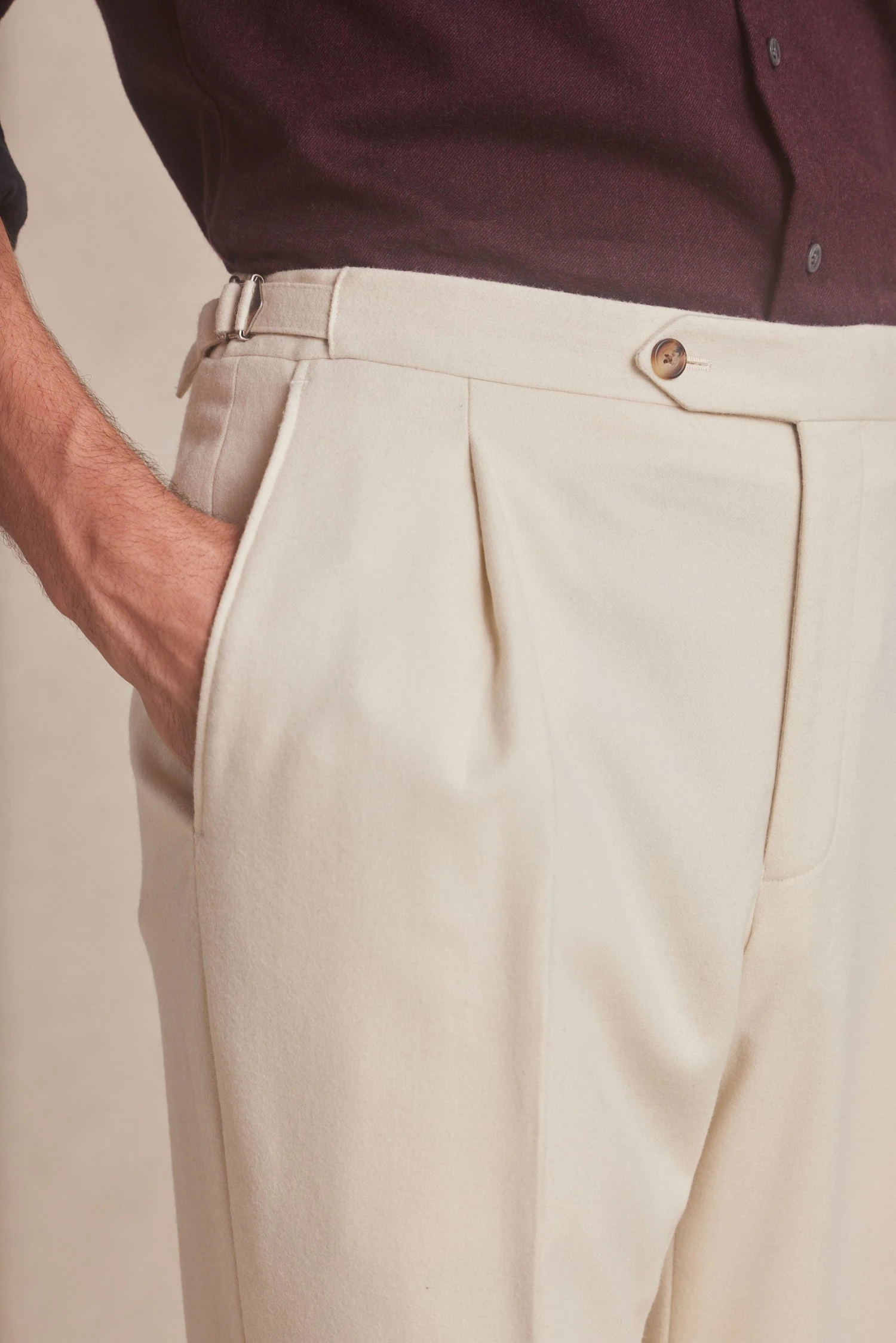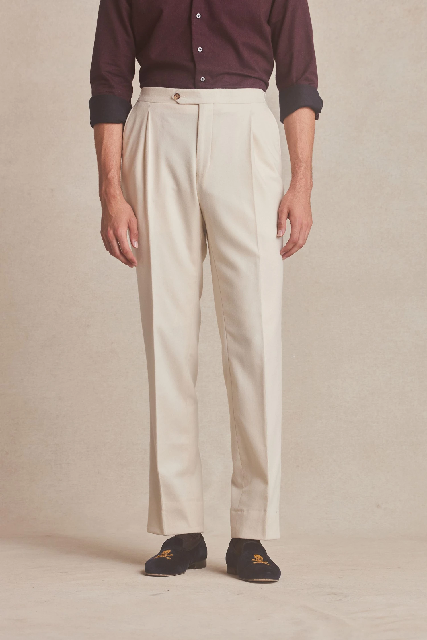 Our Cream Single Pleat Flannel Trousers are tacked at 35 inches so you can have them finished to your ideal length using our complimentary alterations service.