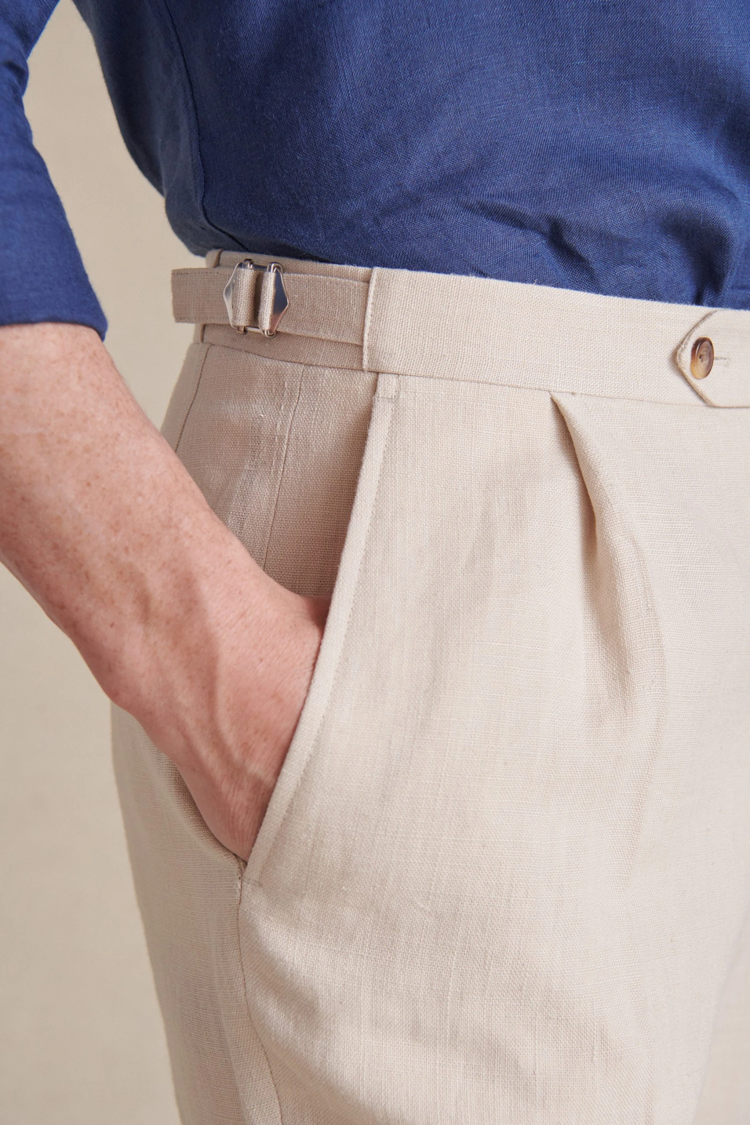 Our Cream Single Pleat Linen Trousers are tacked at 35 inches so you can have them finished to your ideal length using our complimentary alterations service.