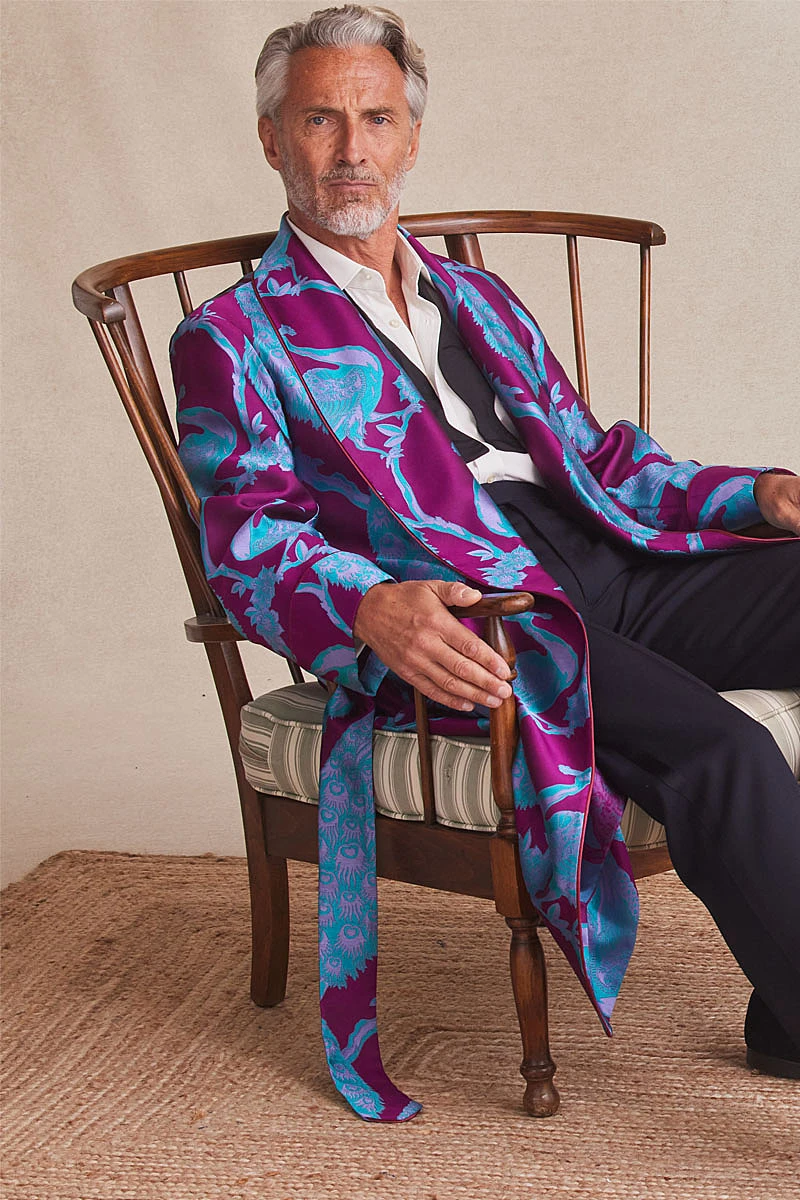 Handmade in 100% English woven silk satin, this gown makes a striking and stylish statement in masculine loungewear.