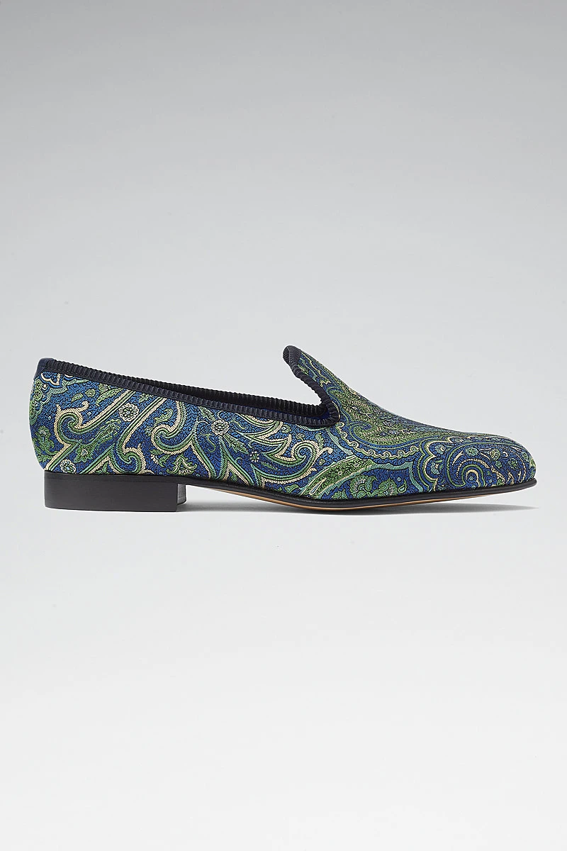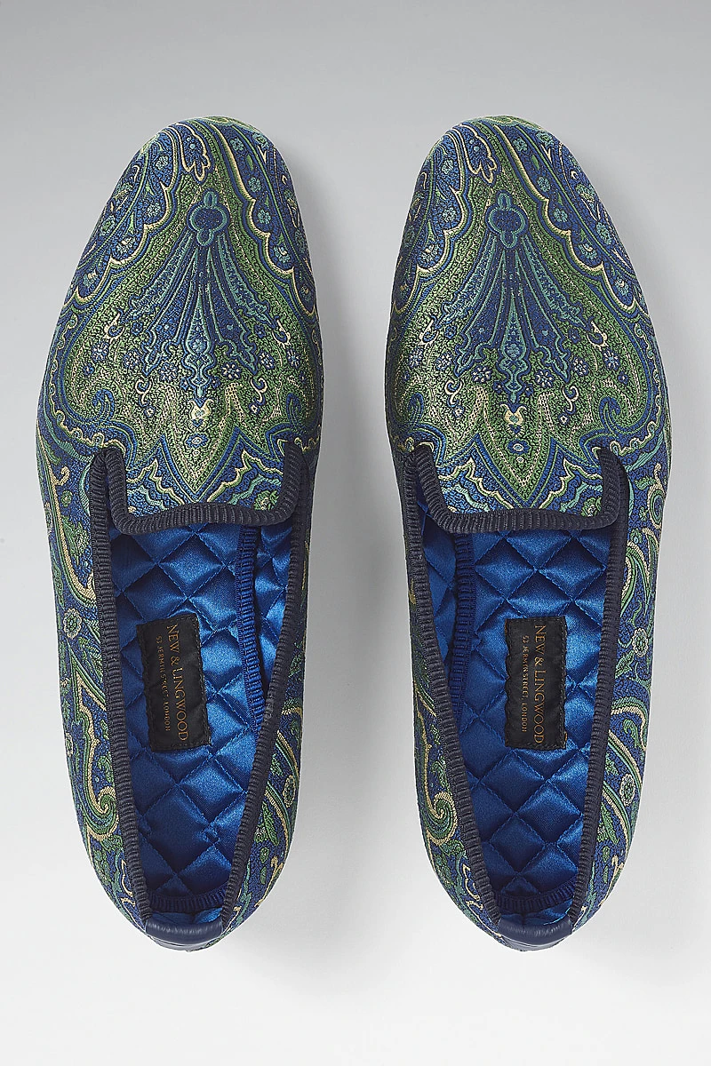 Our Green & Blue Crystal Paisley Slippers feature a rich blue and green crystal paisley design on the outer and are fully lined with quilted blue silk for additional comfort. Pair with matching dressing gown.