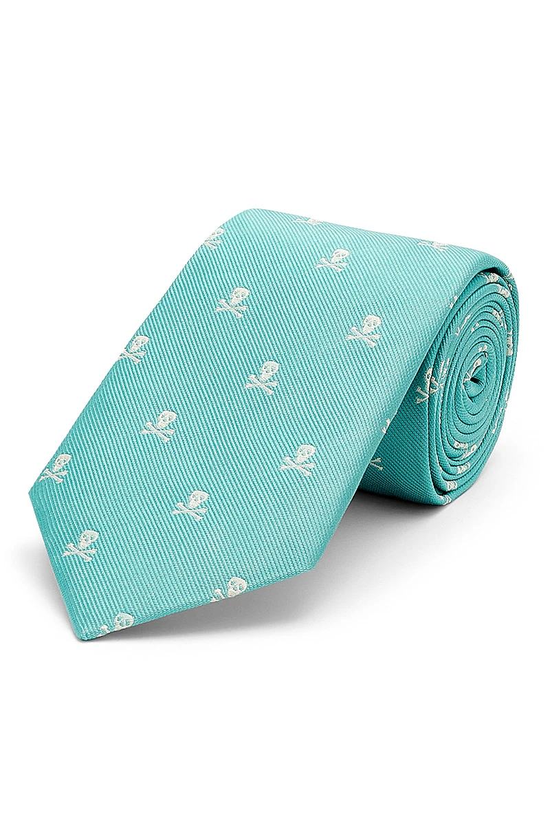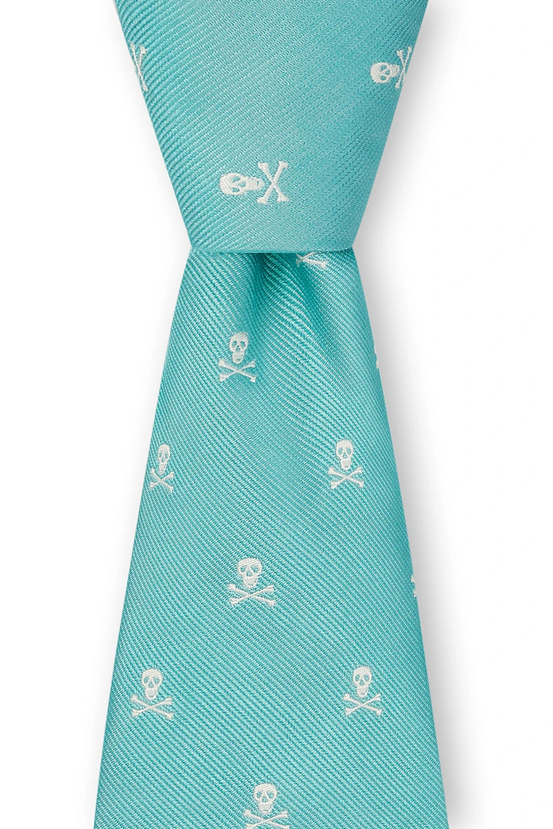 The subtle skull & bones woven into this necktie made an irreverent yet elegant statement. Woven in Sudbury, Suffolk — the traditional heart of English silk production. Hand-finished and self-tipped with slip-stitch construction.