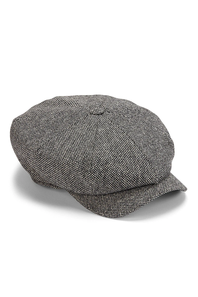 An eight panel newsboy cap cut from a grey flecked cloth in a recycled wool blend.