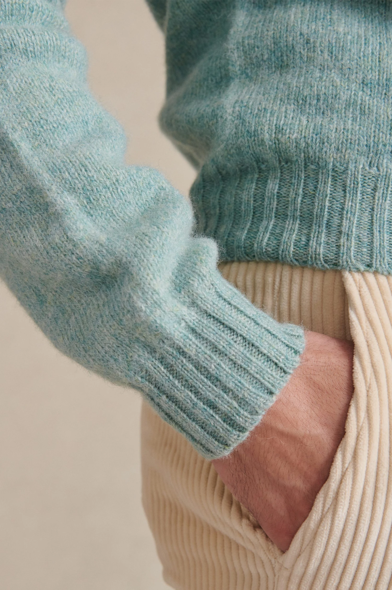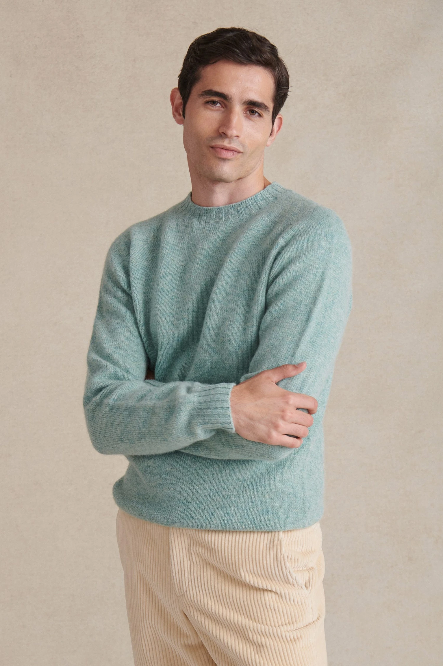 A crew neck jumper made in Scotland from pure super soft lambswool. Features ribbing at the waist, collar, and cuffs.