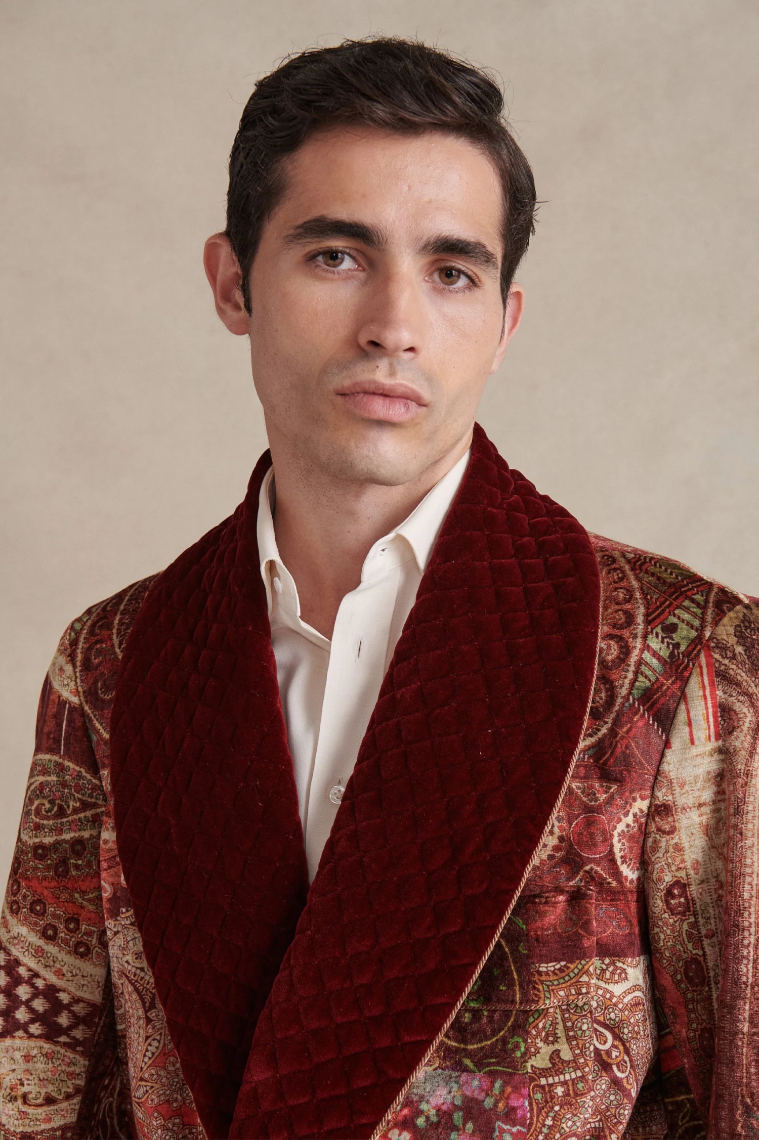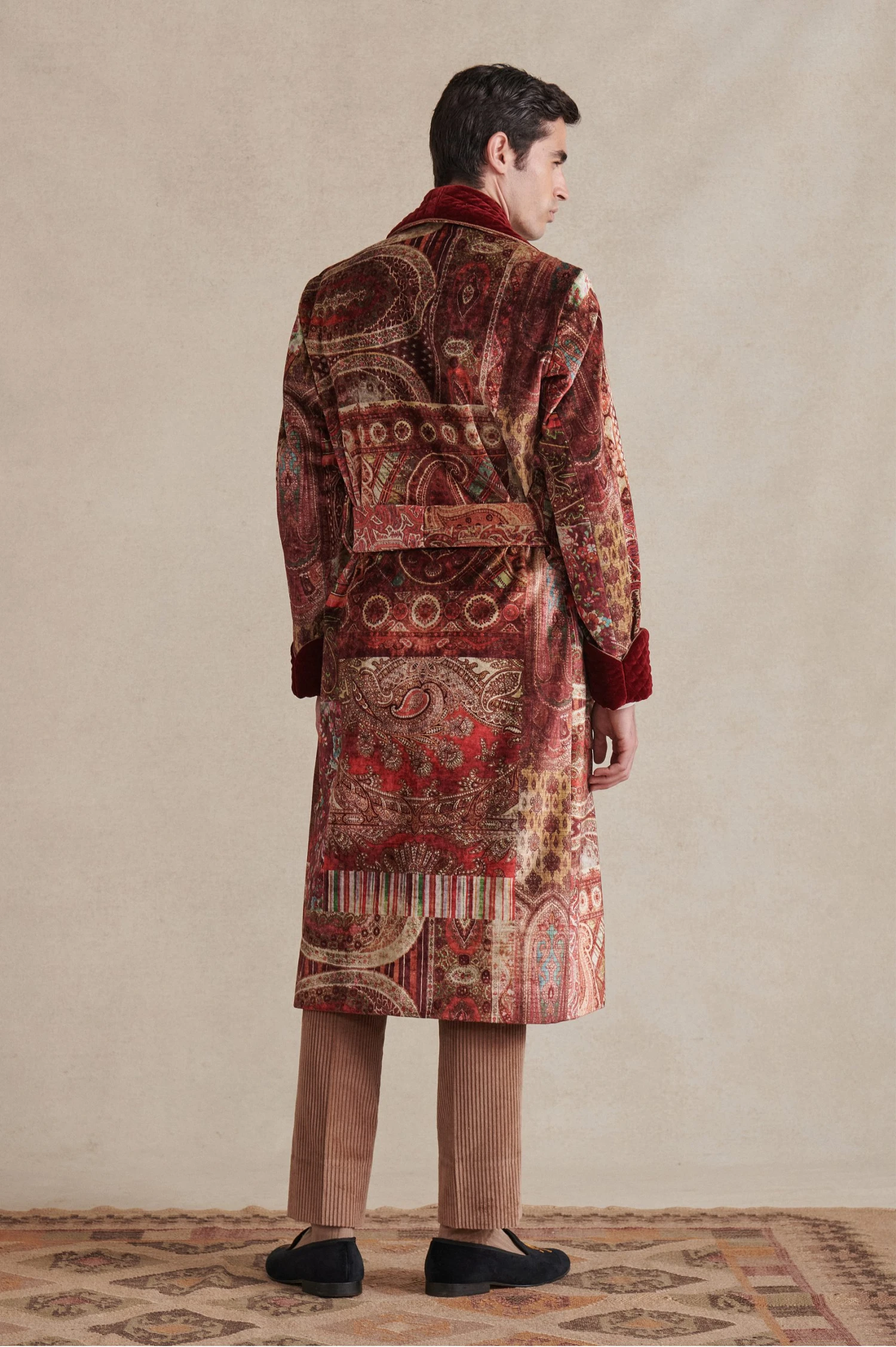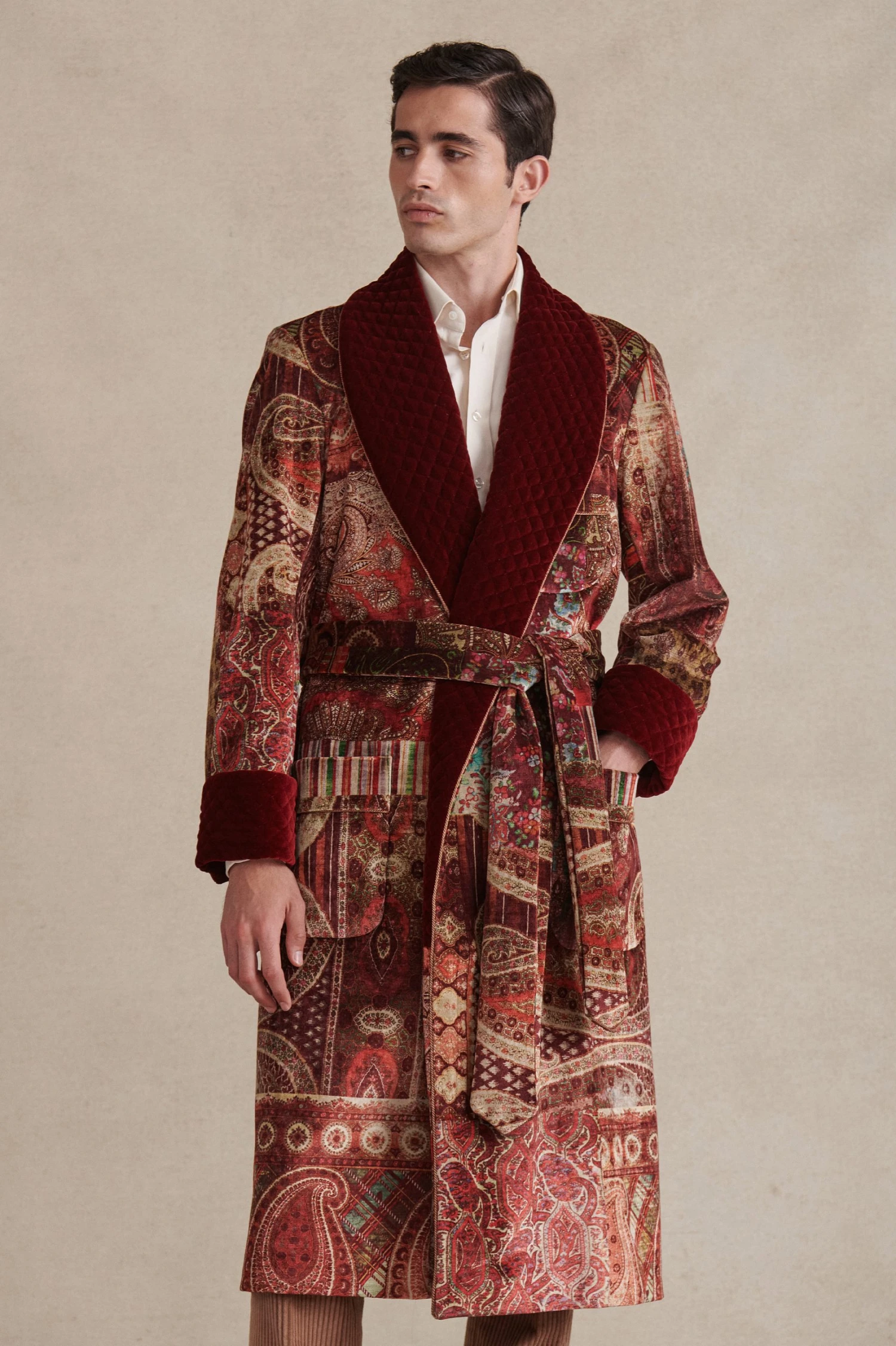 A lined dressing gown featuring a patchwork tapestry pattern with prominent reds and burgundys, printed on velvet. Handmade at our Jermyn St. atelier. Finished with contrasting quilted velvet cuffs and lapels.