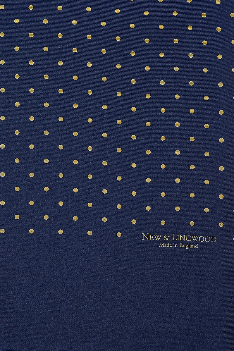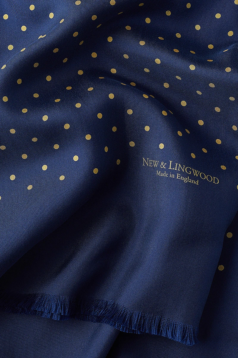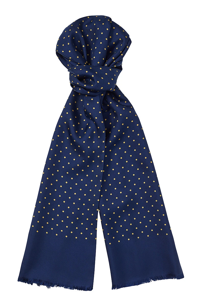 To add a layer of colour and sophistication to a gentleman’s outfit, our Navy Antique Spotted Scarf is the perfect accessory. Crisply printed on heavyweight 16oz English silk this classic scarf is unimpeachably tasteful.