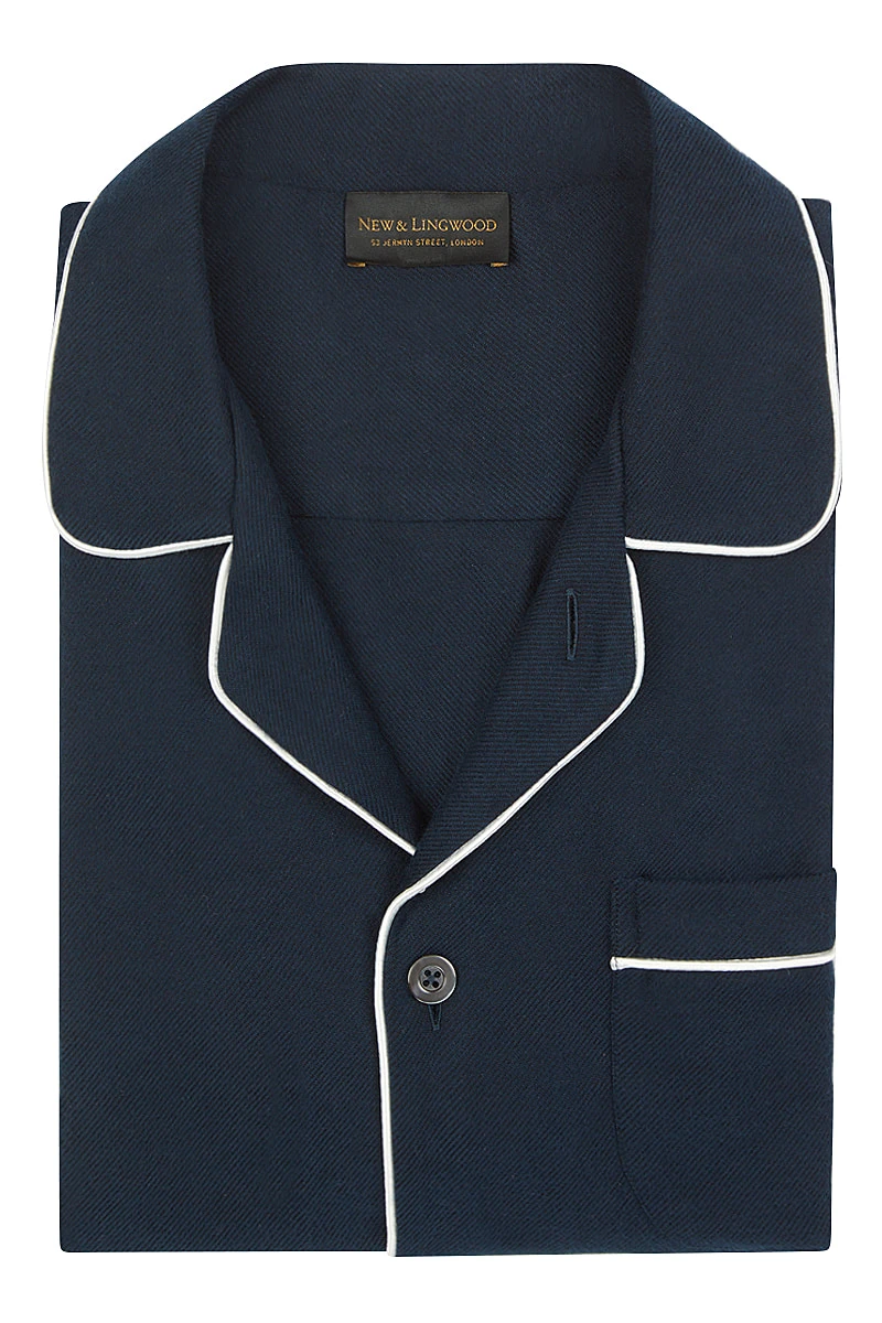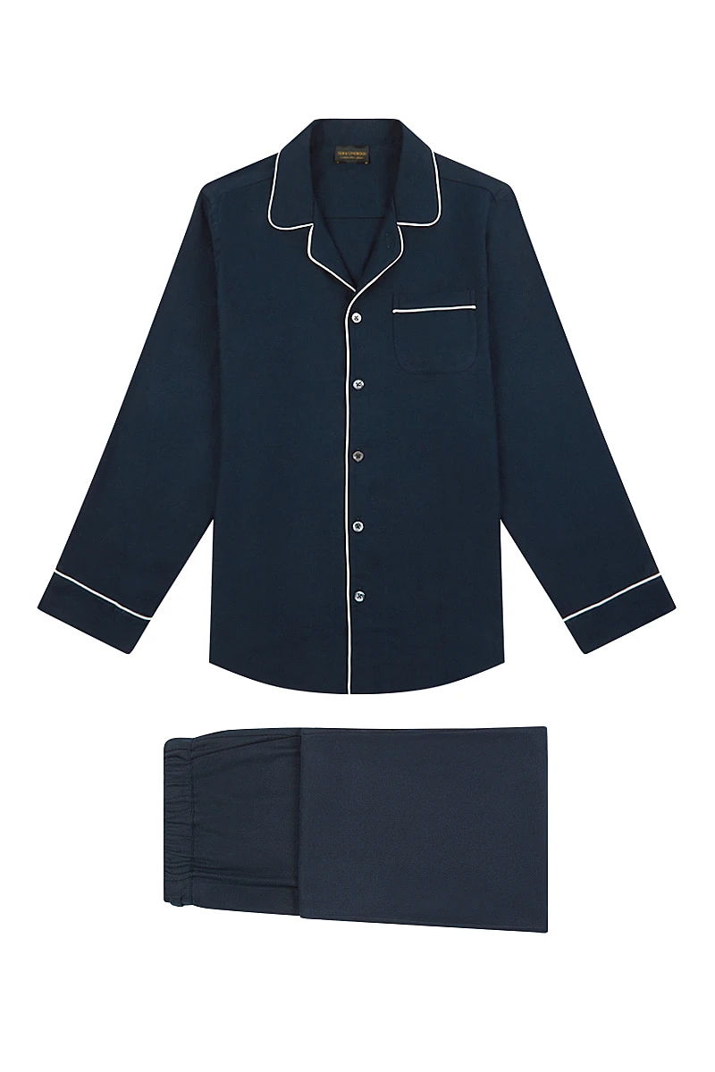 A pyjama set made from brushed cotton flannel. Featuring a modern cut with tapered leg, piped trim and a chest pocket.