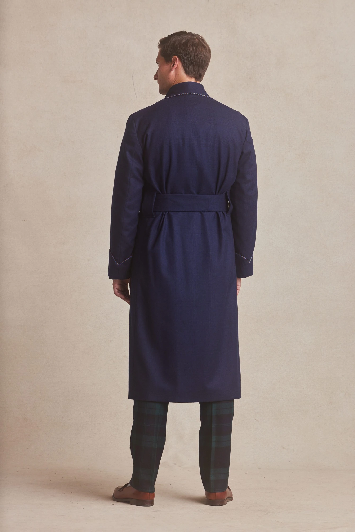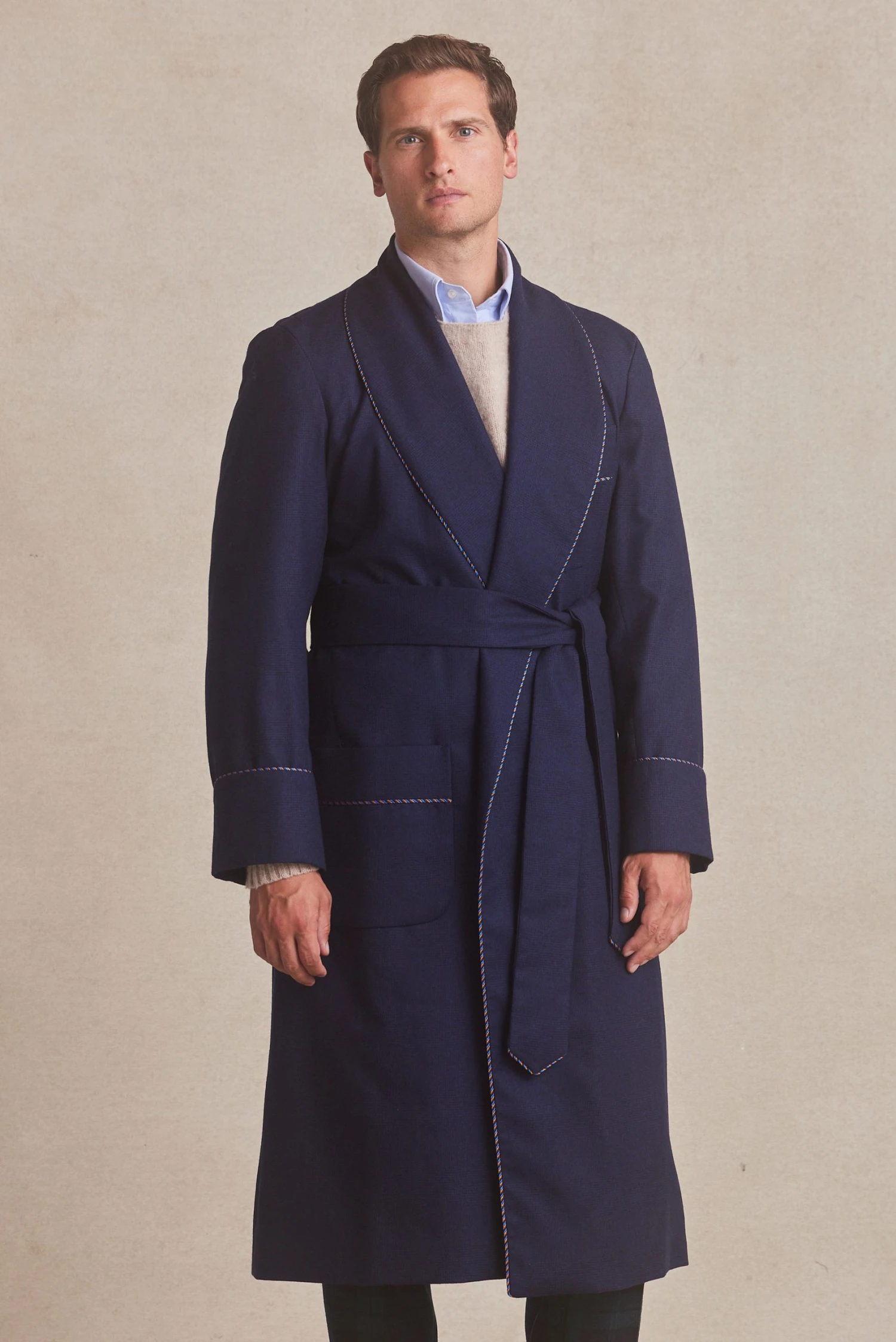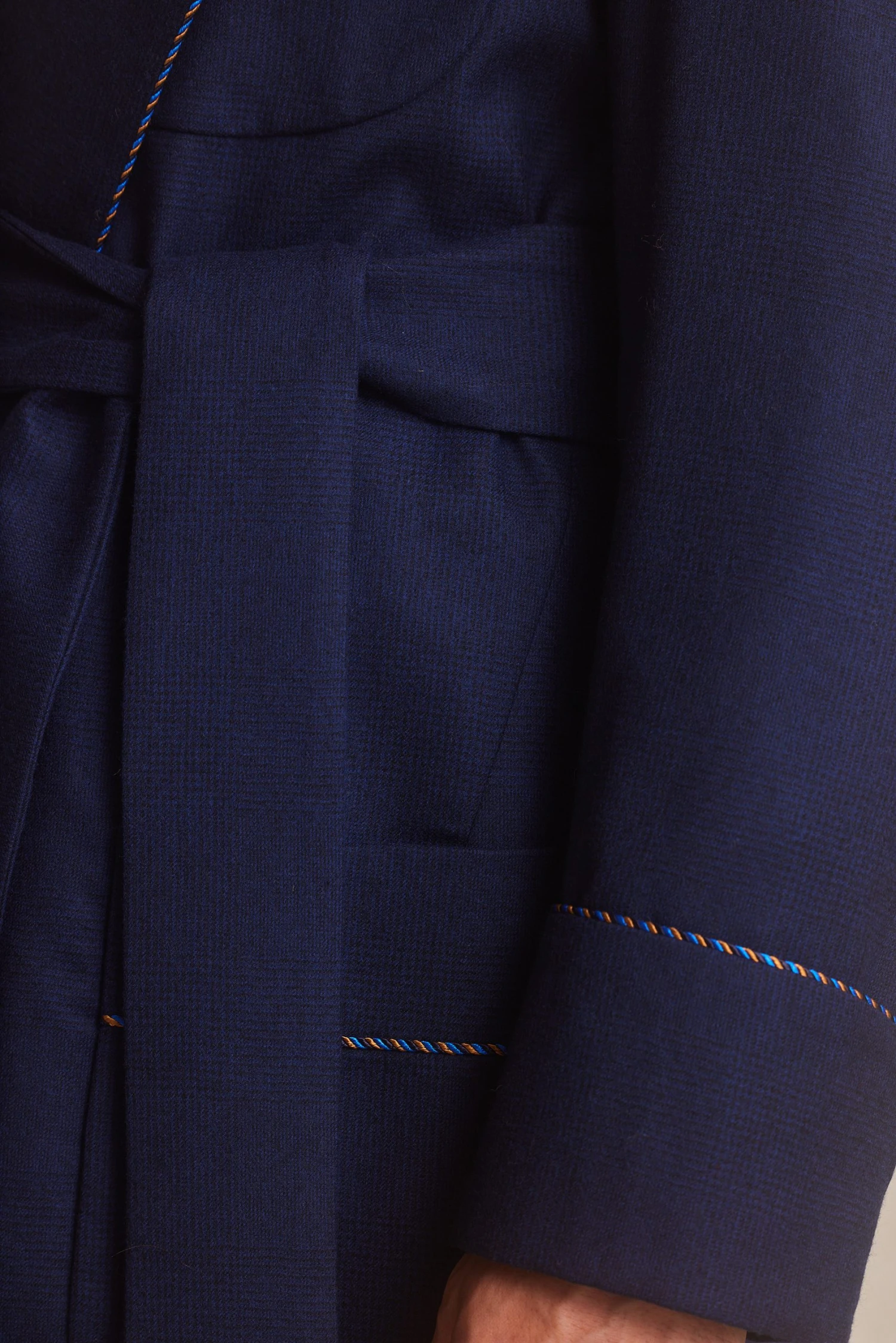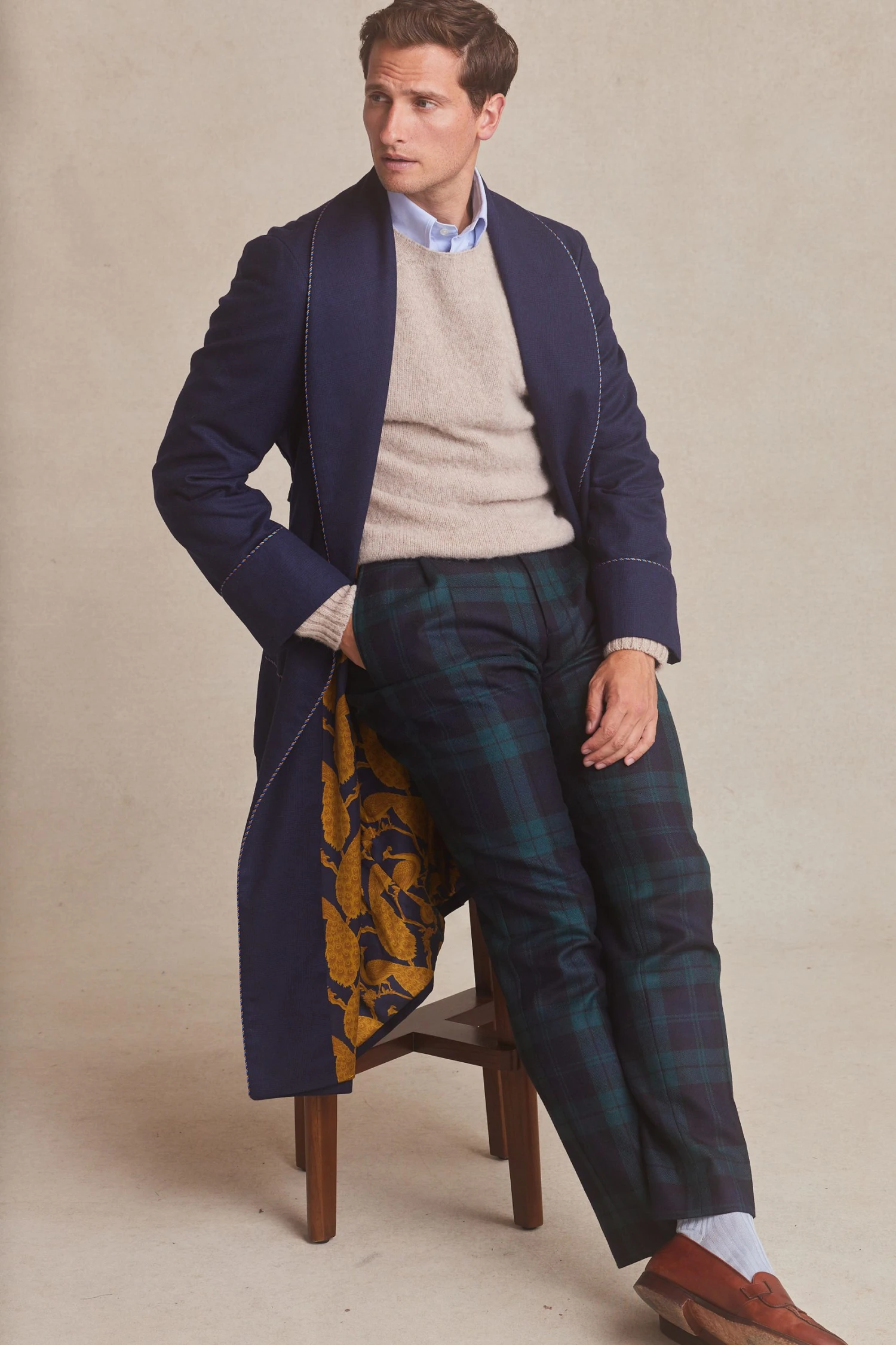 A tonal navy check runs through the soft 100% Merino wool of this subtly luxurious lined dressing gown, made in the UK from cloth woven in the west of England by the venerable mill of Fox Brothers. Lined with our signature peacock pattern rendered in silk and cotton and trimmed with a twsited cord of complimentary colours.