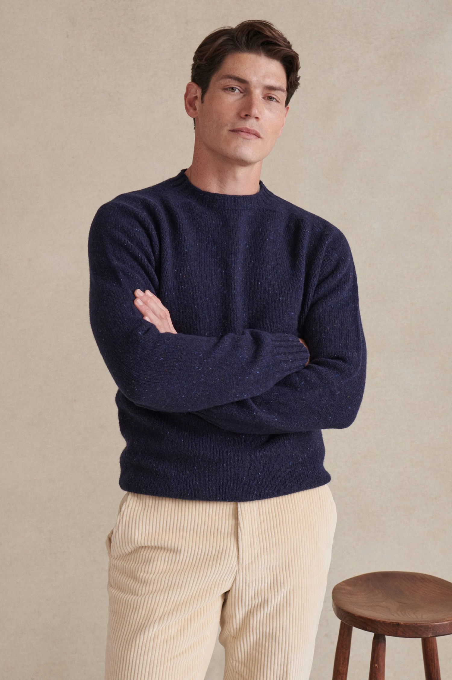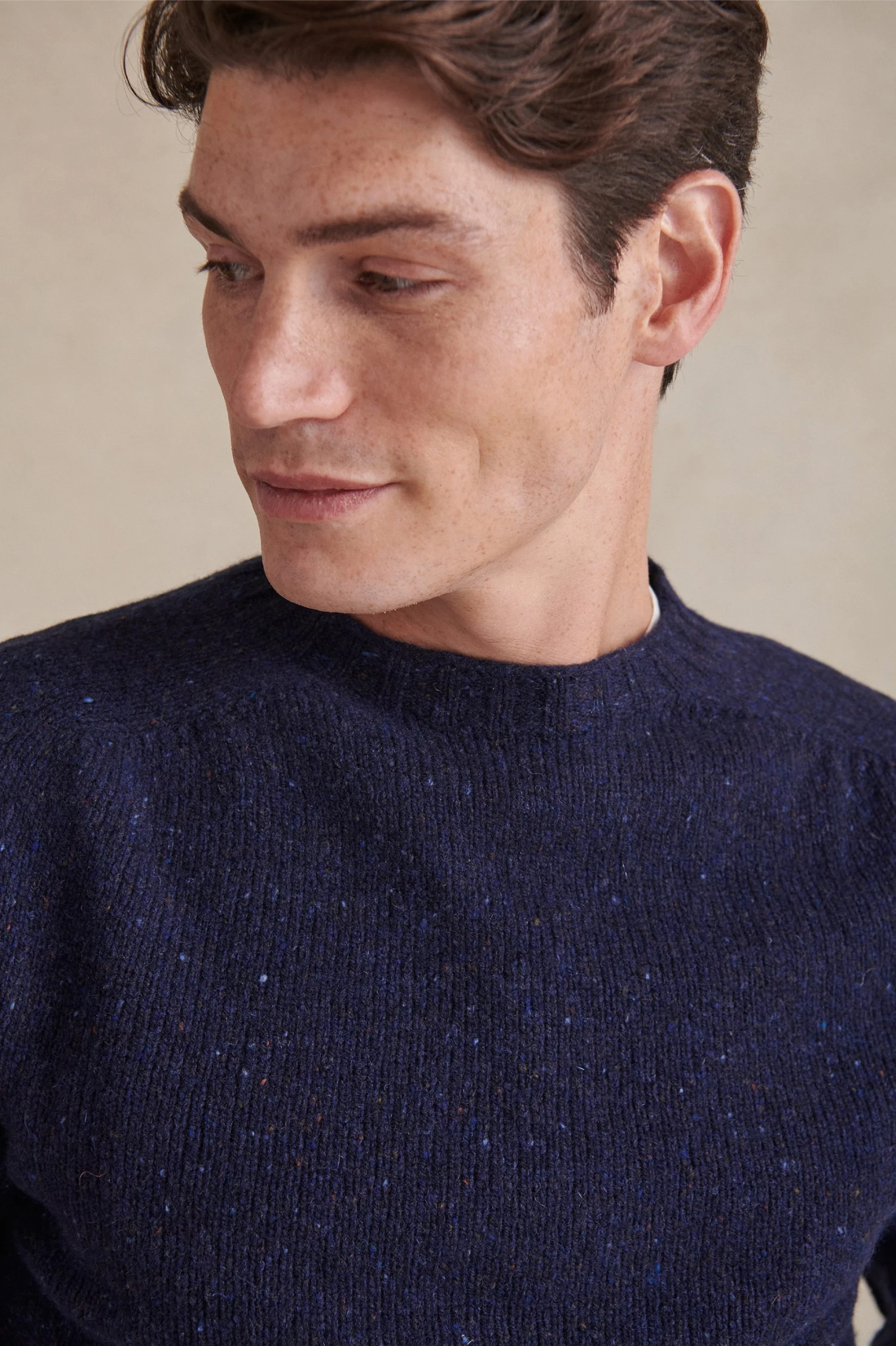 A crew neck jumper made in Scotland from multicolour Donegal flecked pure wool. Features ribbing at the waist, collar, and cuffs.