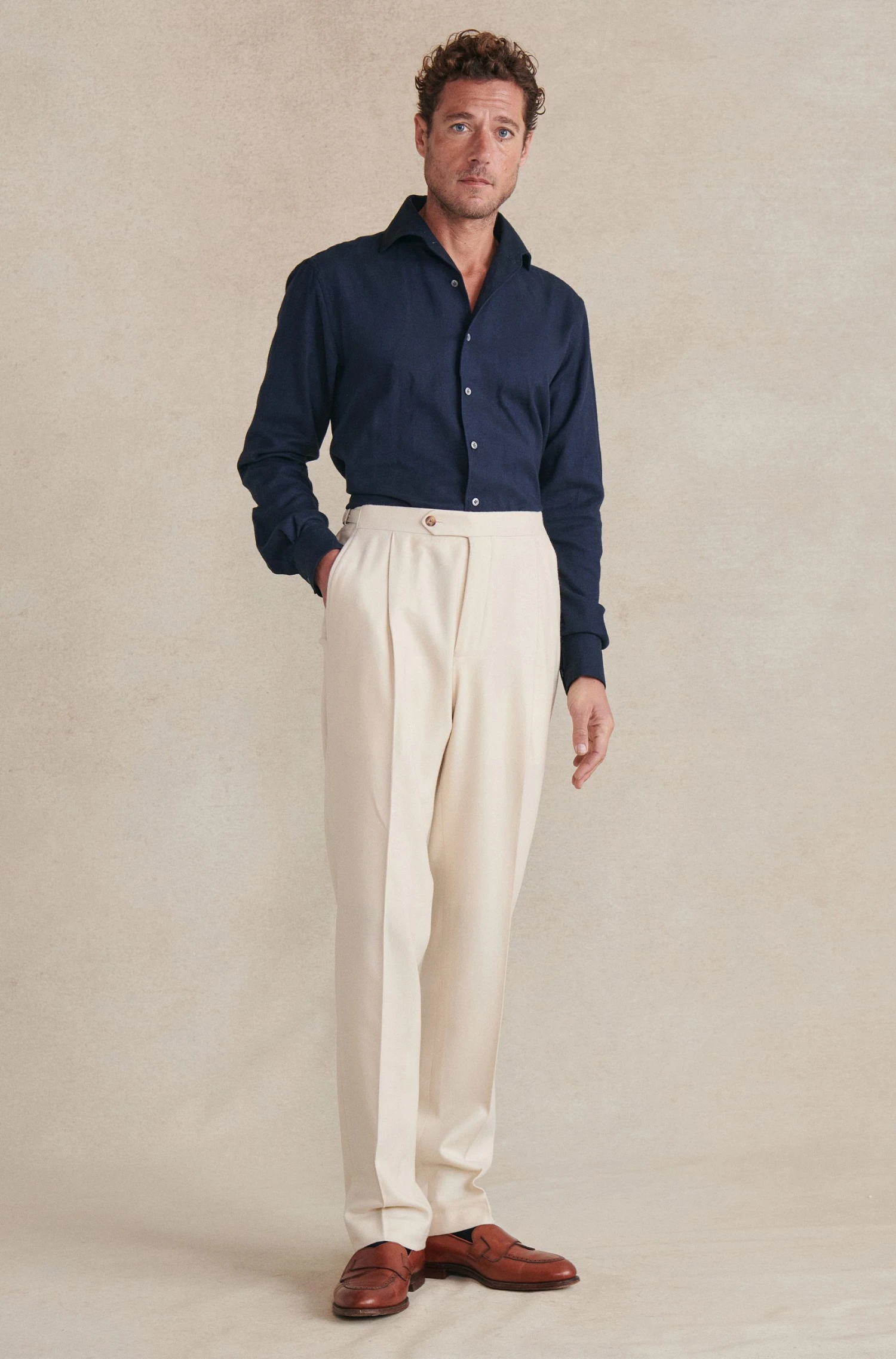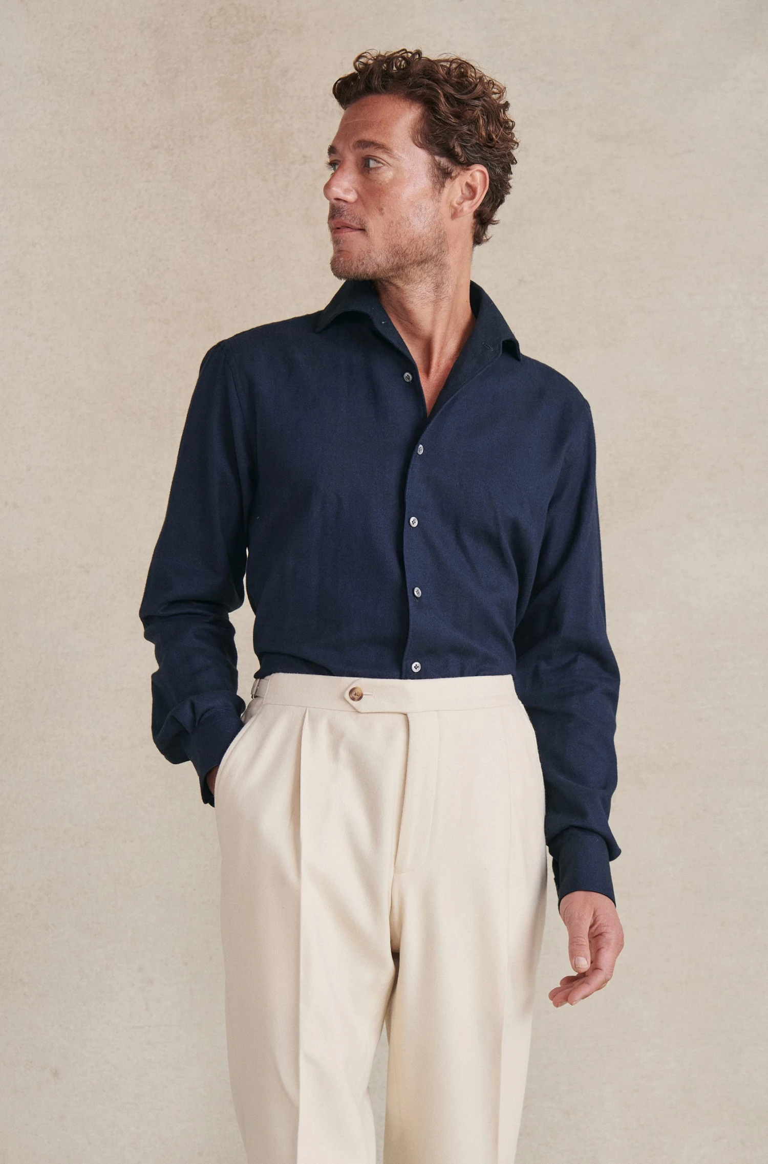 A brushed cotton flannel herringbone weave shirt. Finished with a one piece collar, French placket, and adjustable button cuffs.