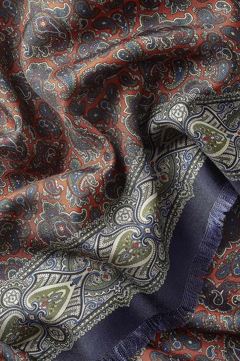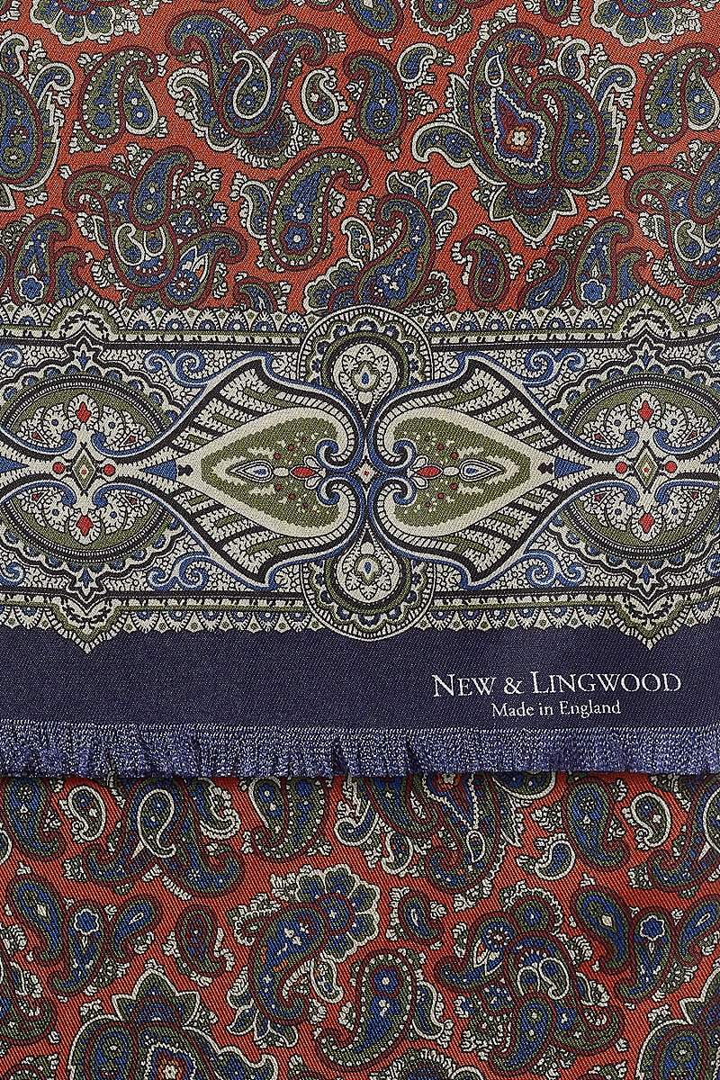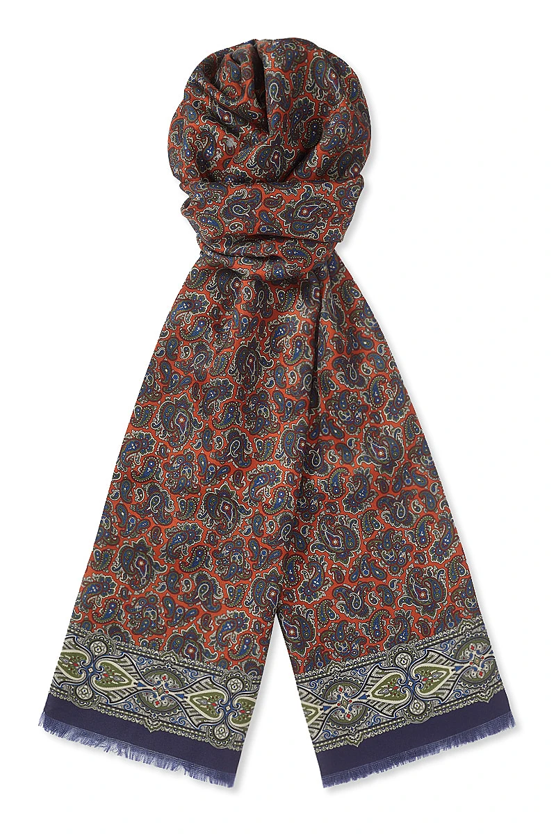 An intricately bold border encloses a field of smaller-scale paisley on this 100% silk pin-fringed scarf.