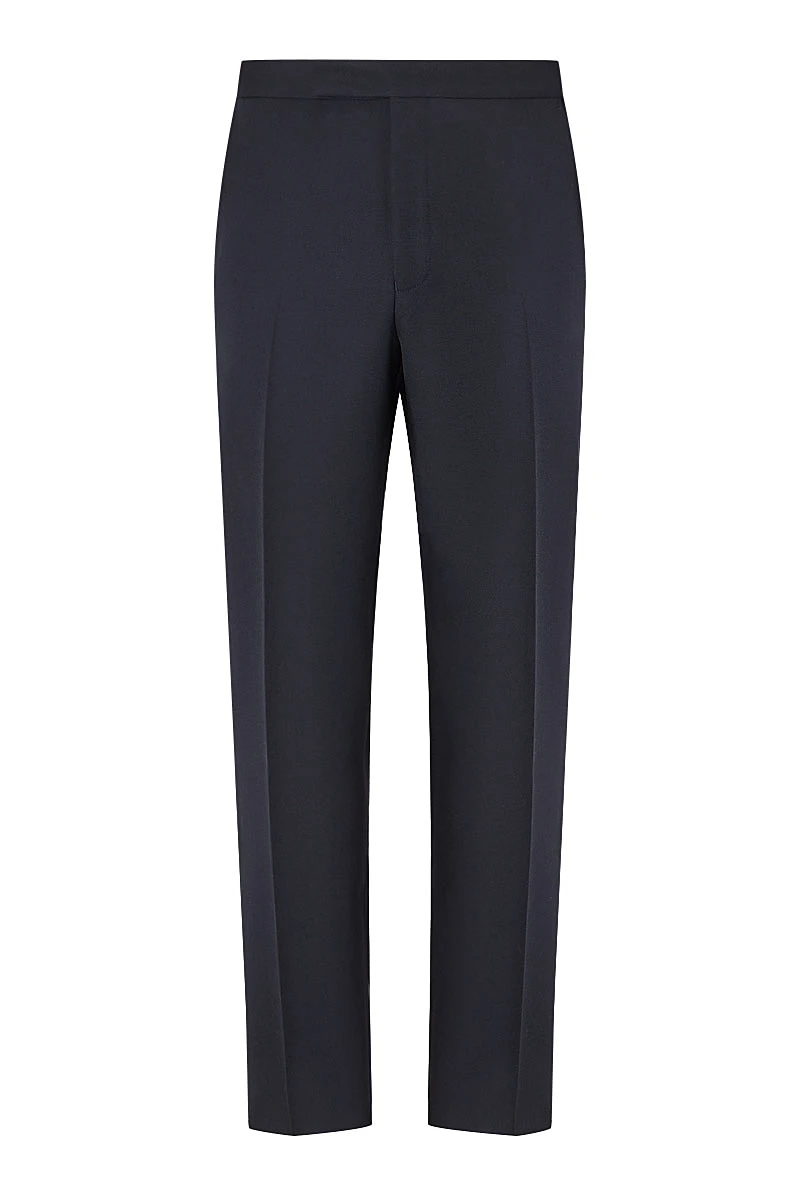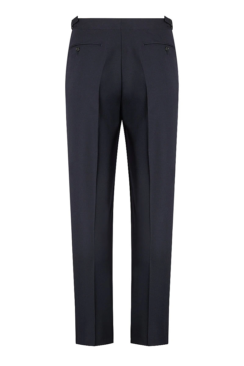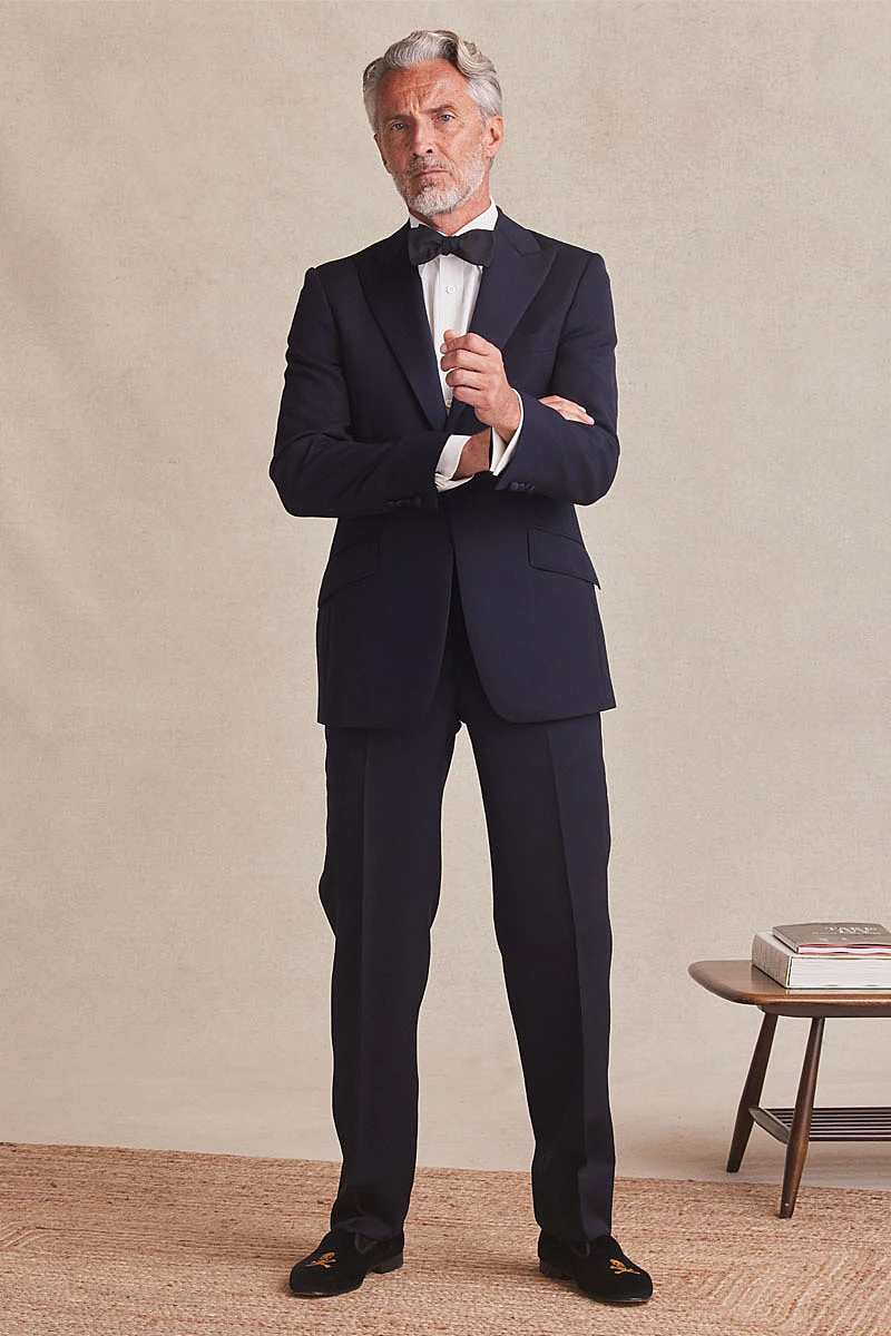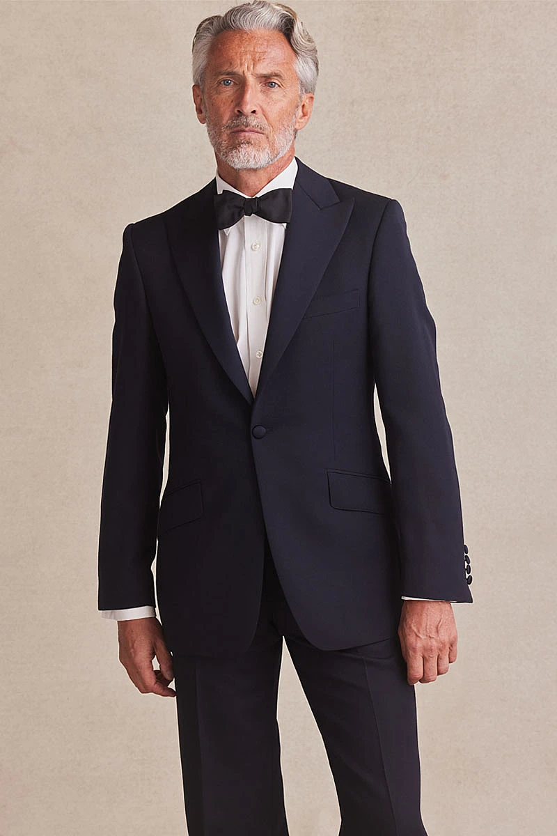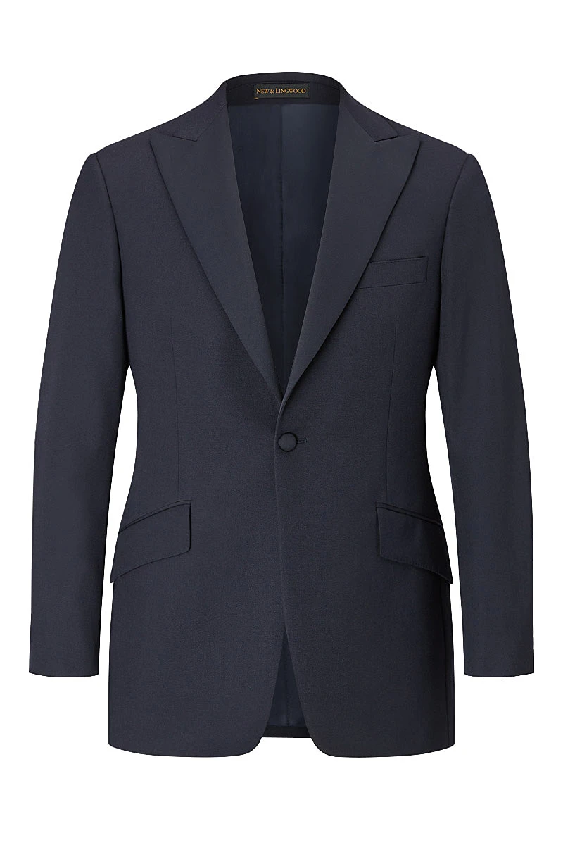 The New & Lingwood dinner suit is cut as tradition dictates; with elegant peaked lapels, one button to fasten the jacket and silk facings on the lapels and buttons. As with all our tailoring, the suit is cut to the very highest standard in superfine wool barathea woven in Yorkshire, tailored with superior half-canvas construction. The trousers are flat fronted and finished with side adjusters for a clean look. Pair with a pleated or marcella fronted dress shirt, black satin bow and our patent leather opera pumps for an evening look that will cut a dash, no matter the occasion.