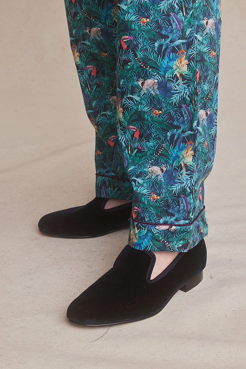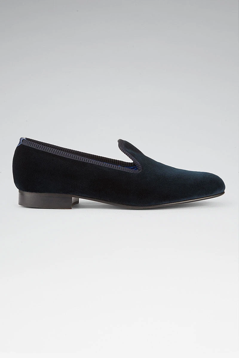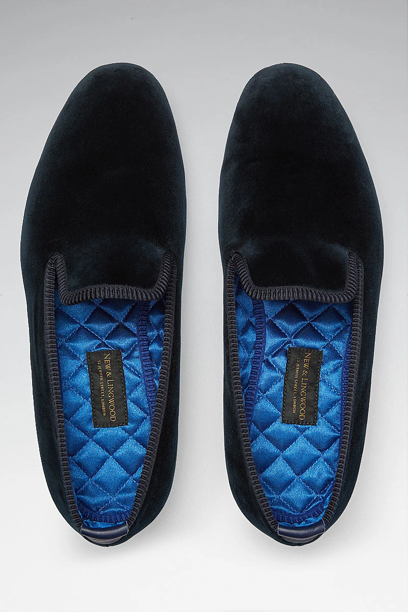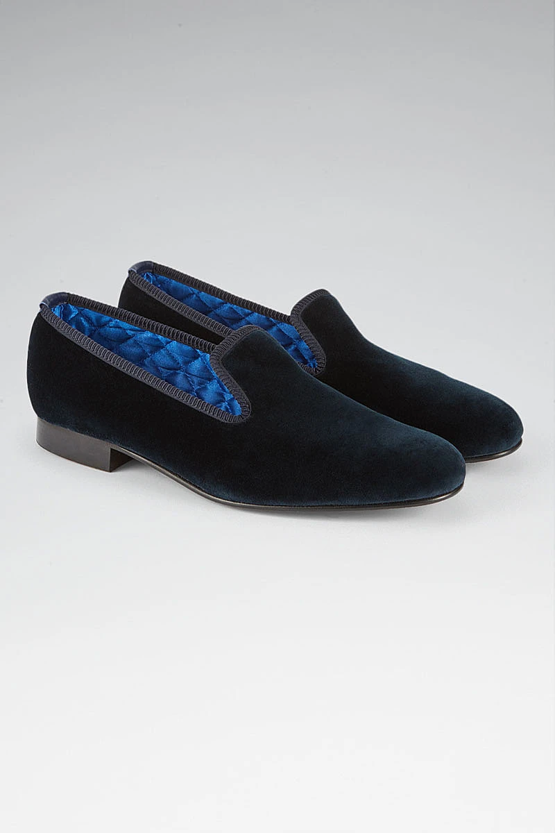 We have updated our classic velvet Albert slippers to feature a soft slimline rubber sole to make a shoe that is fit for all purposes whilst maintaining their traditional elegance. Boasting a luxuriously deep navy velvet outer layer these slippers are fully lined with quilted royal blue silk for additional comfort.