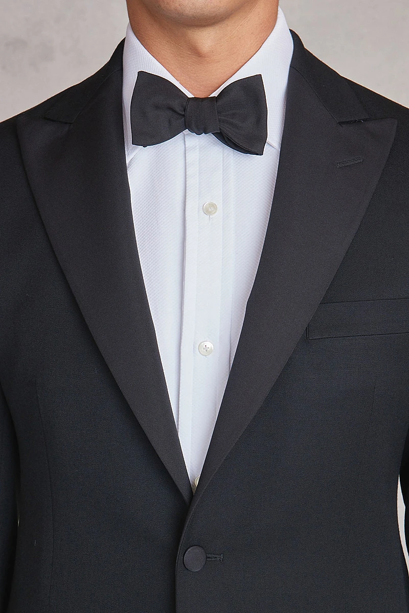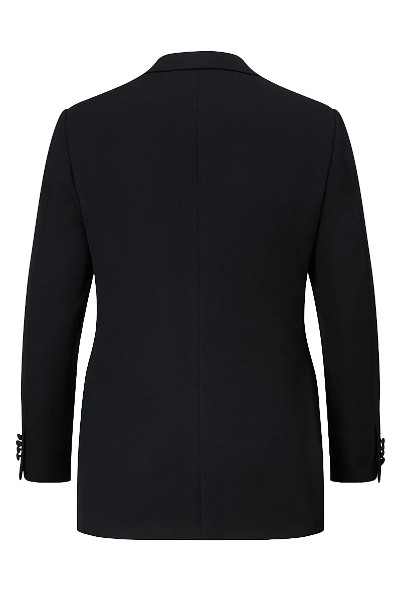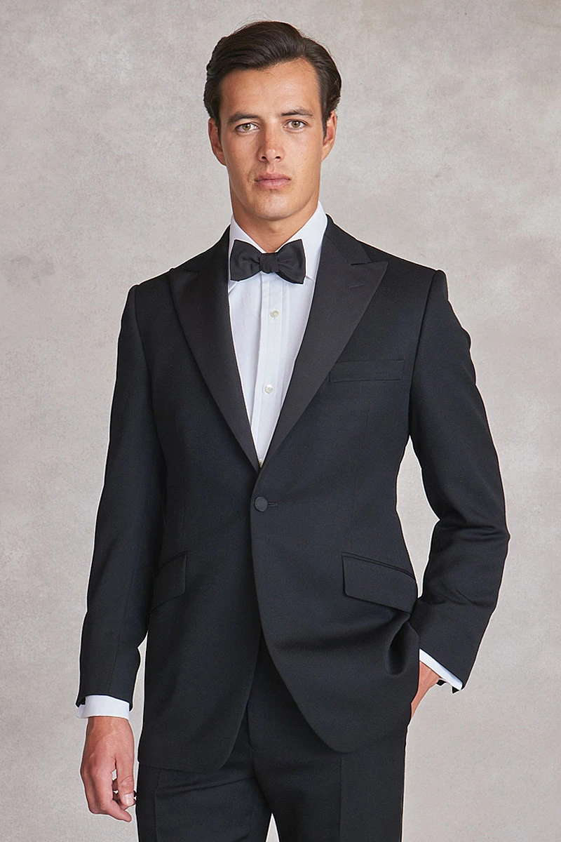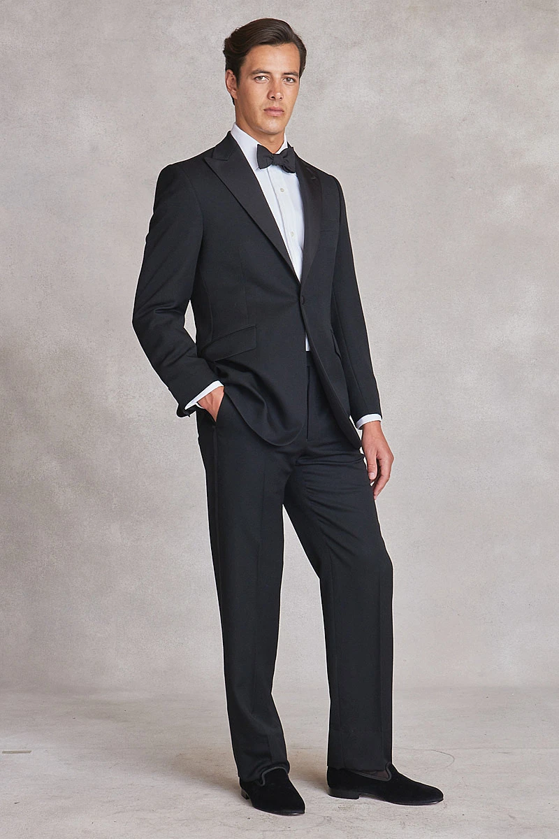 The single-breasted peak lapel evening jacket is made in a traditional semi-canvassed construction lined in a rich black jacquard fabric.