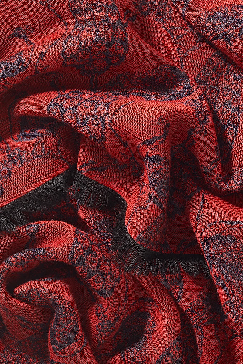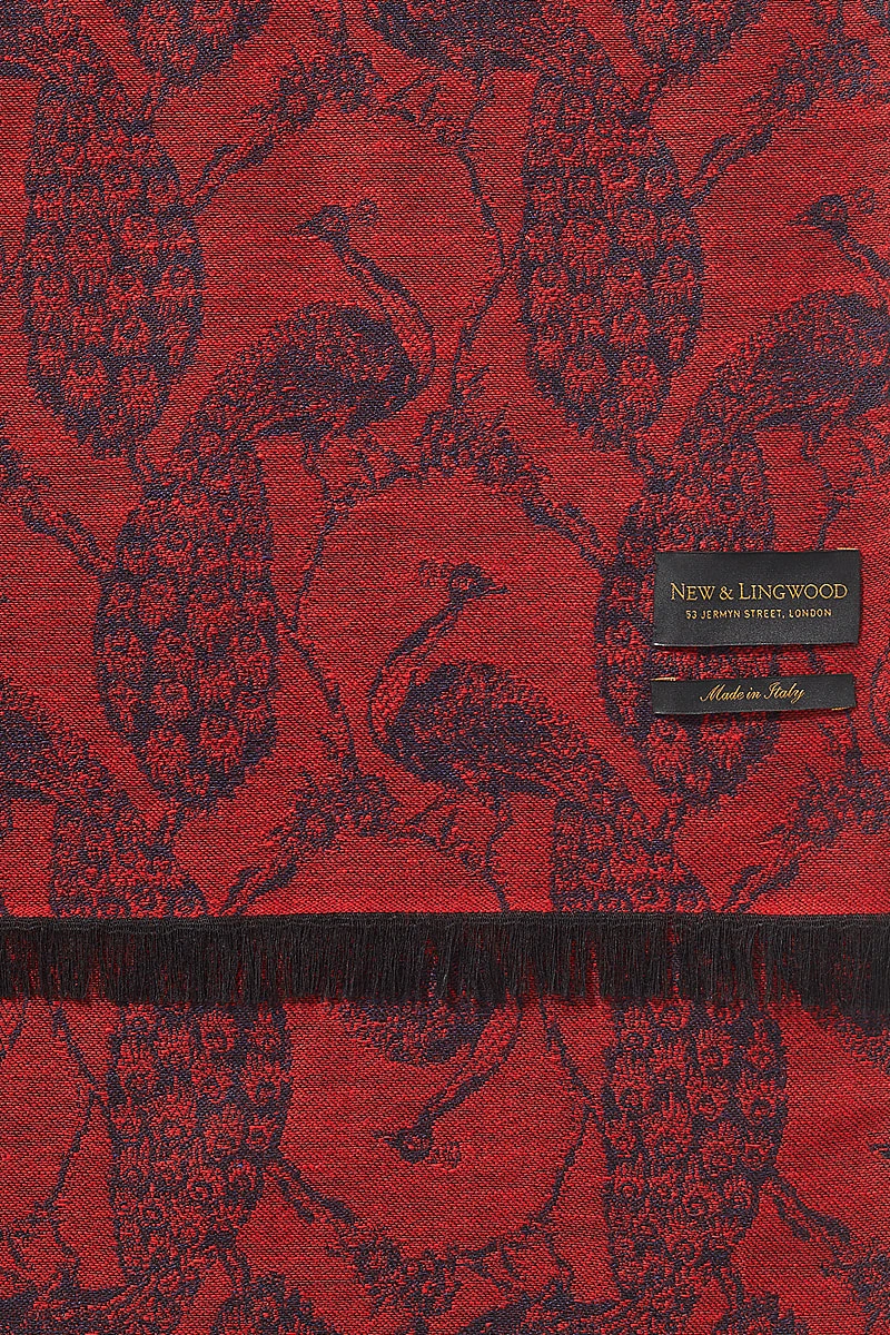 A scarf made in Italy from a wool and silk blend. Printed with our signature peacock motif.