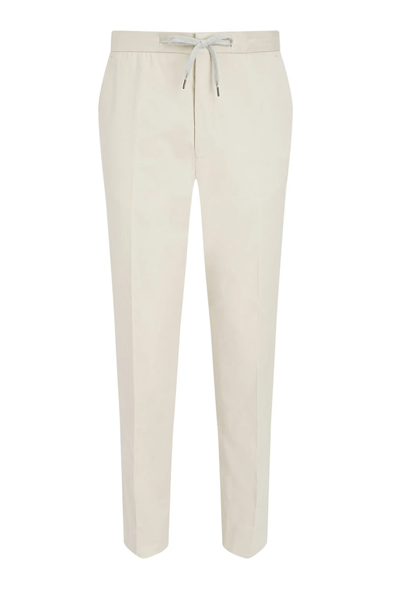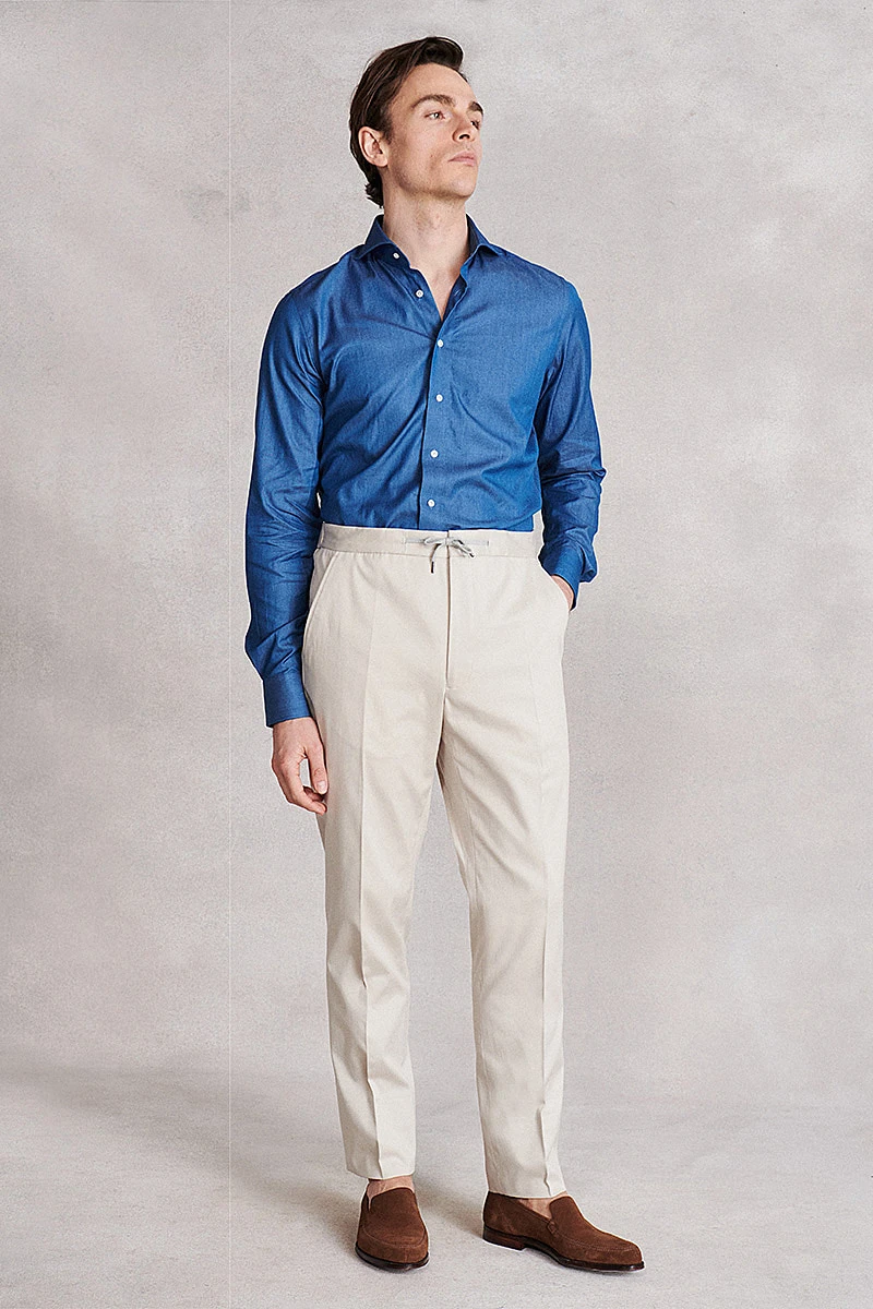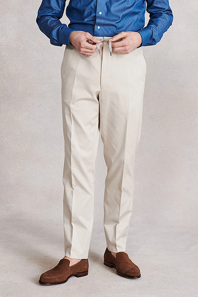 Our Stone Flat Front Drawstring Trousers are tacked at 32.3 inches so you can have them finished to your ideal length using our complimentary alterations service.