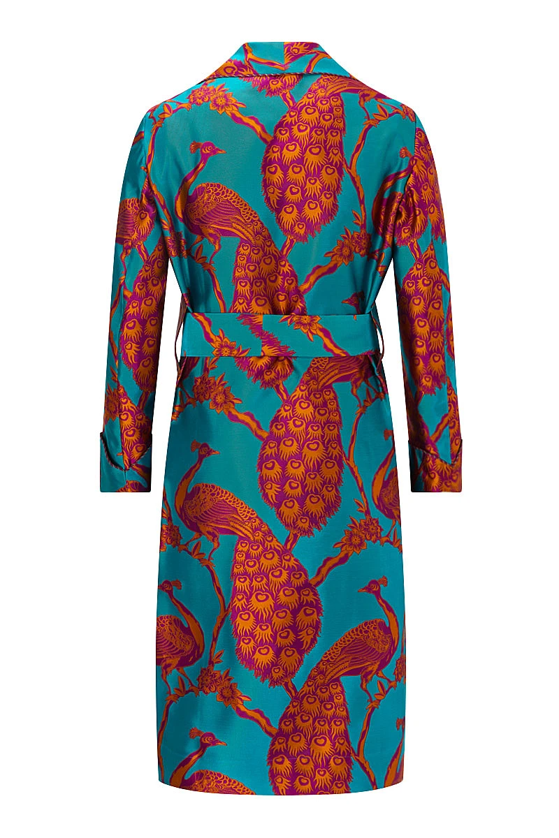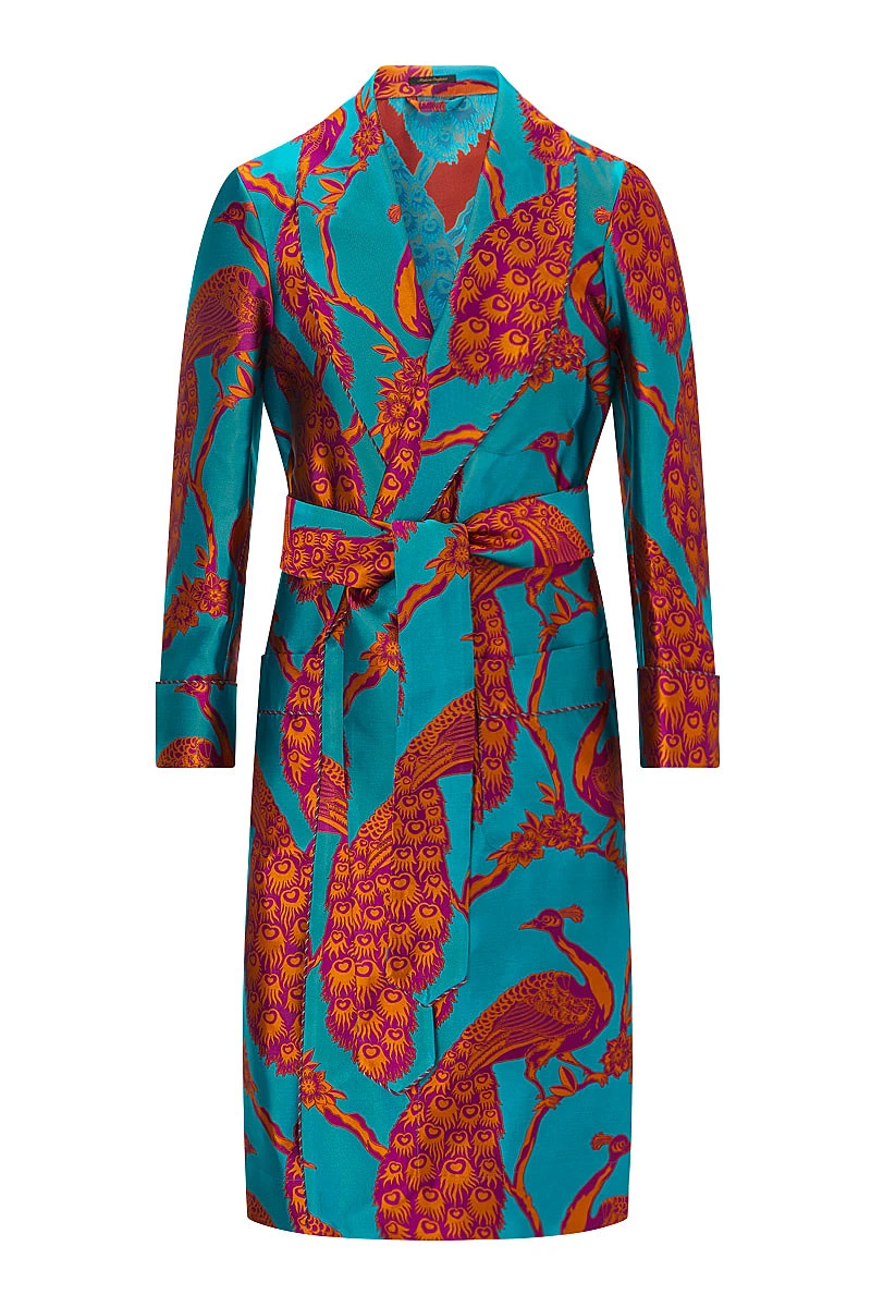 The peacock has long been our signature motif, embodying the rich colours of our clothes and the bold confidence of our customers. This unlined dressing gown is made entirely by hand in England from the weaving of the silk to the construction and features our signature large-scale peacock pattern silk, woven exclusively for us.