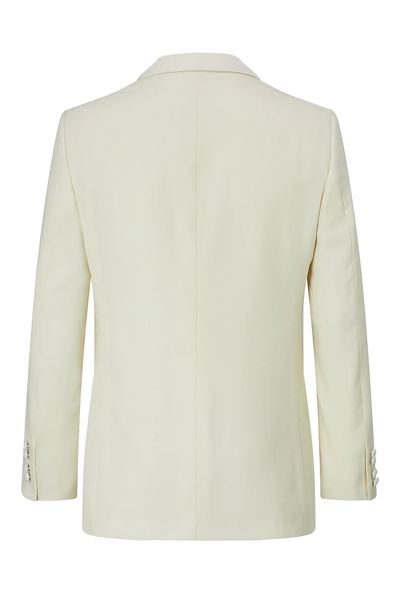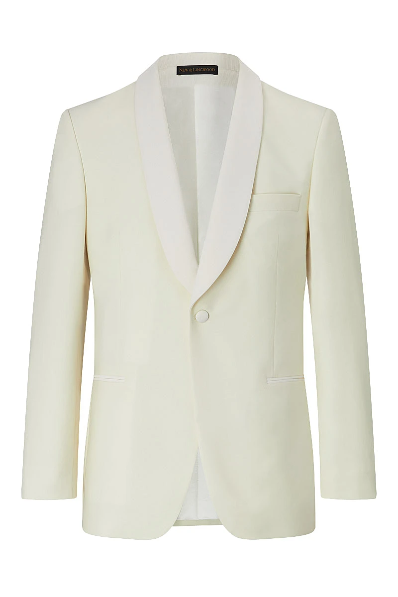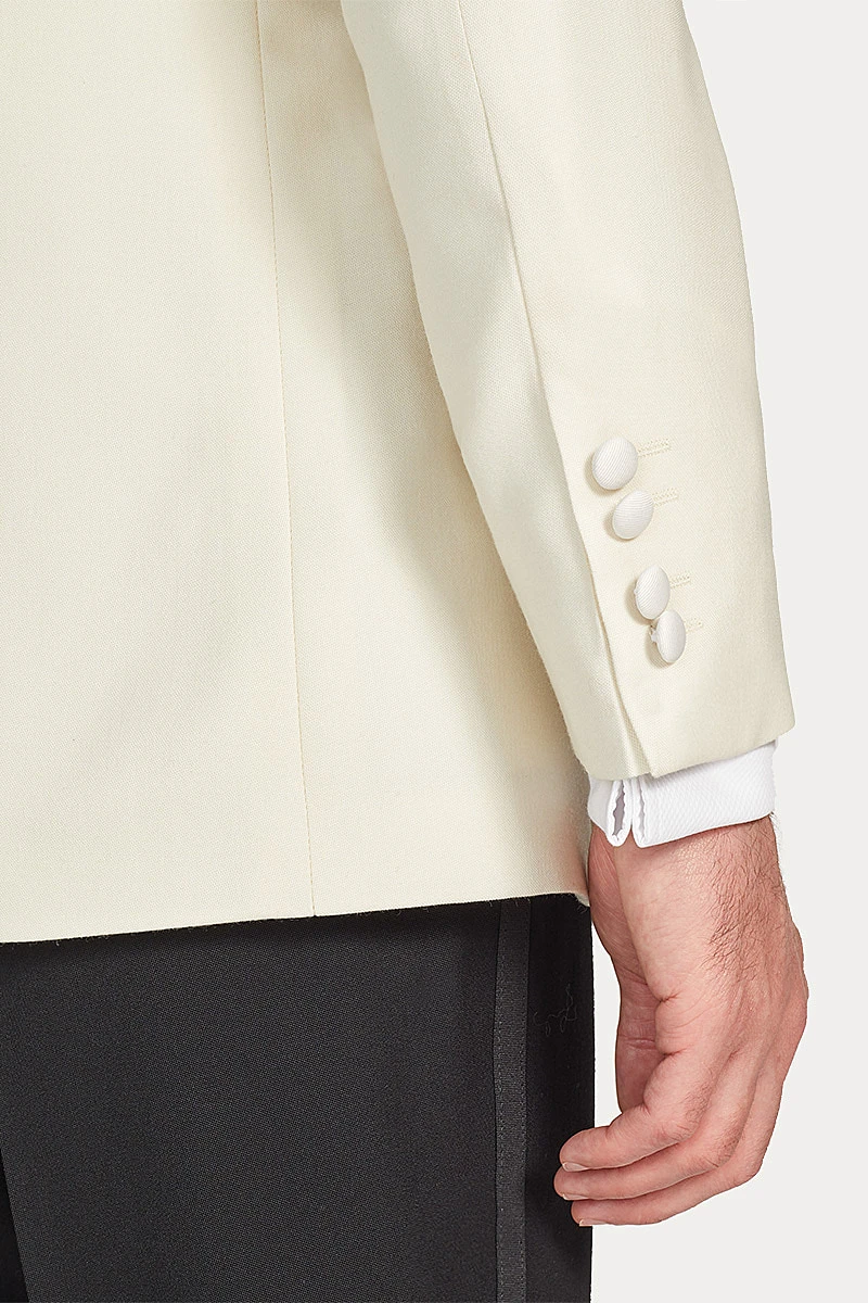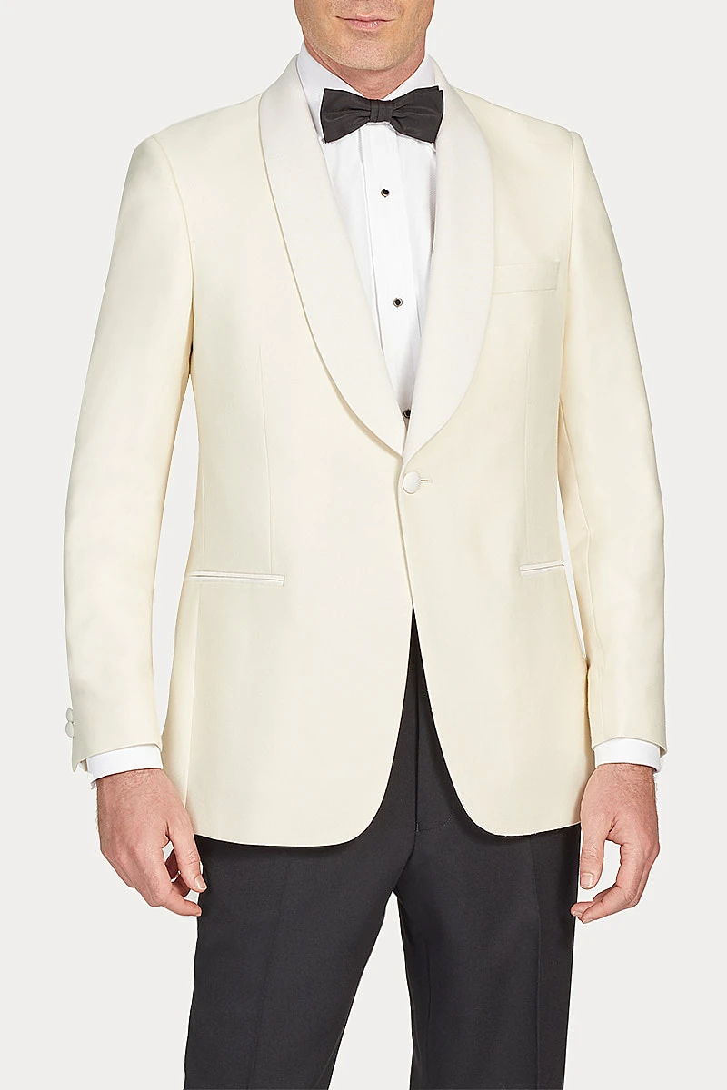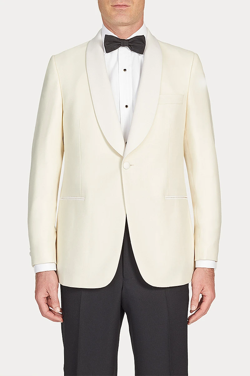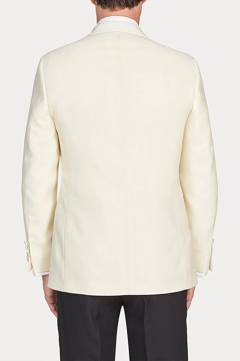 A cream dinner jacket is a sophisticated choice for a Black Tie invitation during the warmer months. This jacket is cut in lightweight off-white wool, woven in Yorkshire with an open structure to keep the wearer cool. The jacket’s sweeping shawl collar is faced with silk grosgrain, as are the jetted pockets and covered buttons. Pair with an ivory silk shirt, black bow tie and cummerbund, and classic black barathea dress trousers.