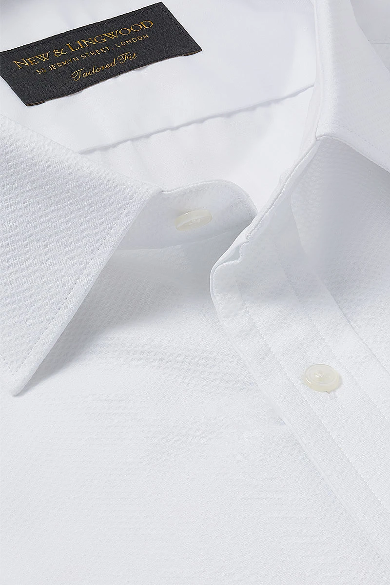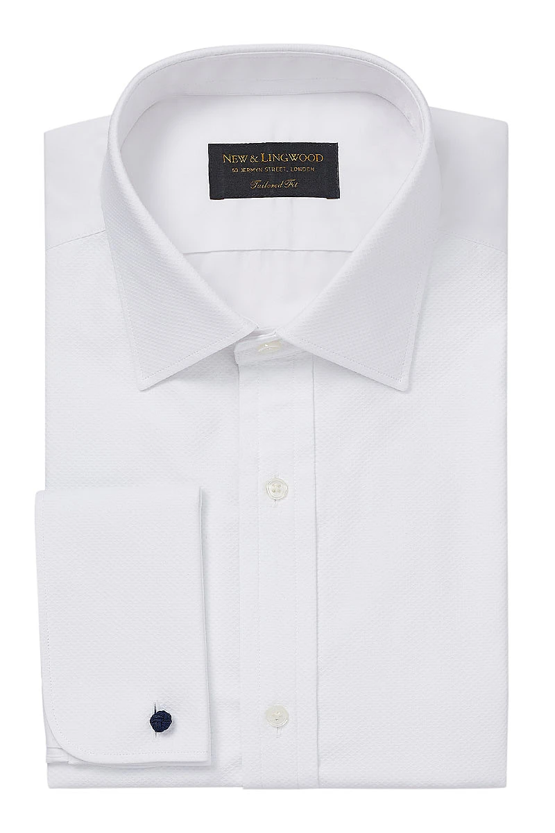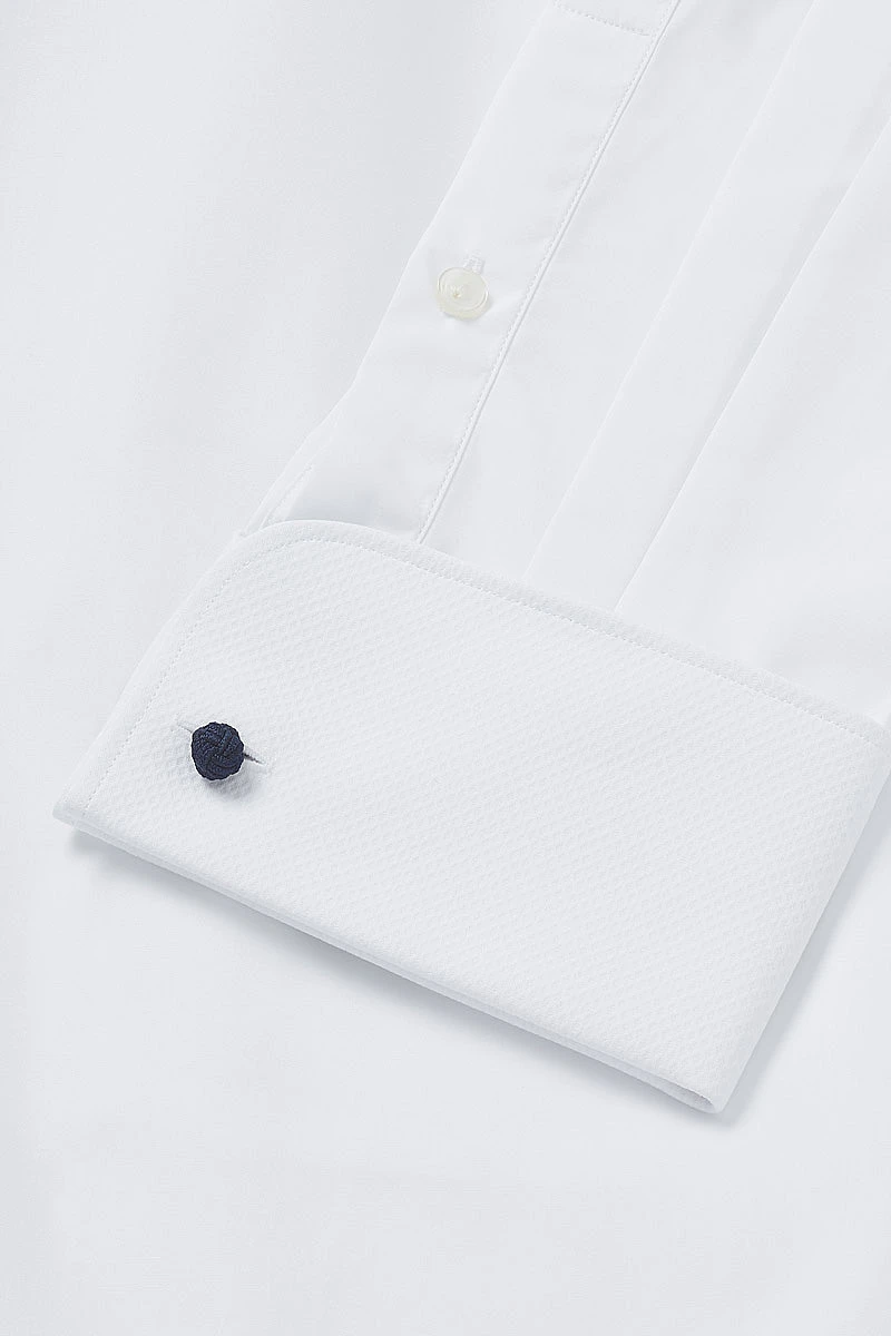 Our very cleverly conceived tailored evening shirt is made to the same exacting standards as our day shirts, using two-fold 100s finest Italian cotton, twelve-piece collar, split yoke and loose-lined double cuffs. The ingenious detail is that it can be worn with or without dress studs. This is enabled by a removable ribbon inside the shirt which carries tradition mother of pearl buttons, which can be removed in one go and then replaced with your own dress studs, be they onyx or diamond! The bib front and cuffs are made from pure cotton waffle piquet, known as Marcella. It features our St. James’s collar.